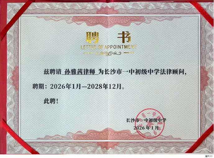 作为长沙市一中初级中学的优秀毕业生,孙雅茜律师表示非常荣幸此次能够获聘为母校的外聘法律顾问。在三年聘期内,她将充分发挥专业优势,积极履行法律顾问职责,为学校提供精准、高效的法律服务,深入参与校园法治建设,尽她所能回馈母校。