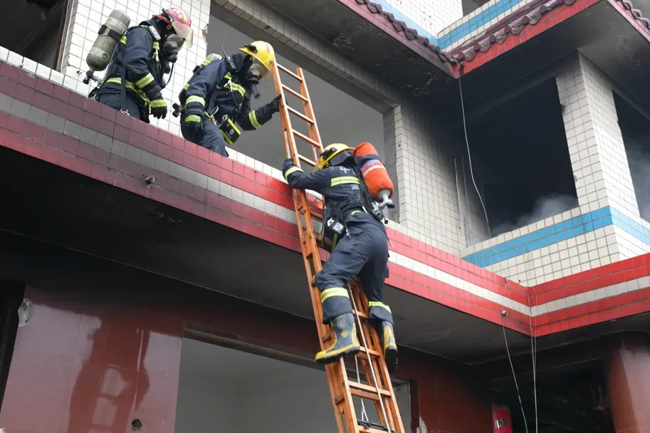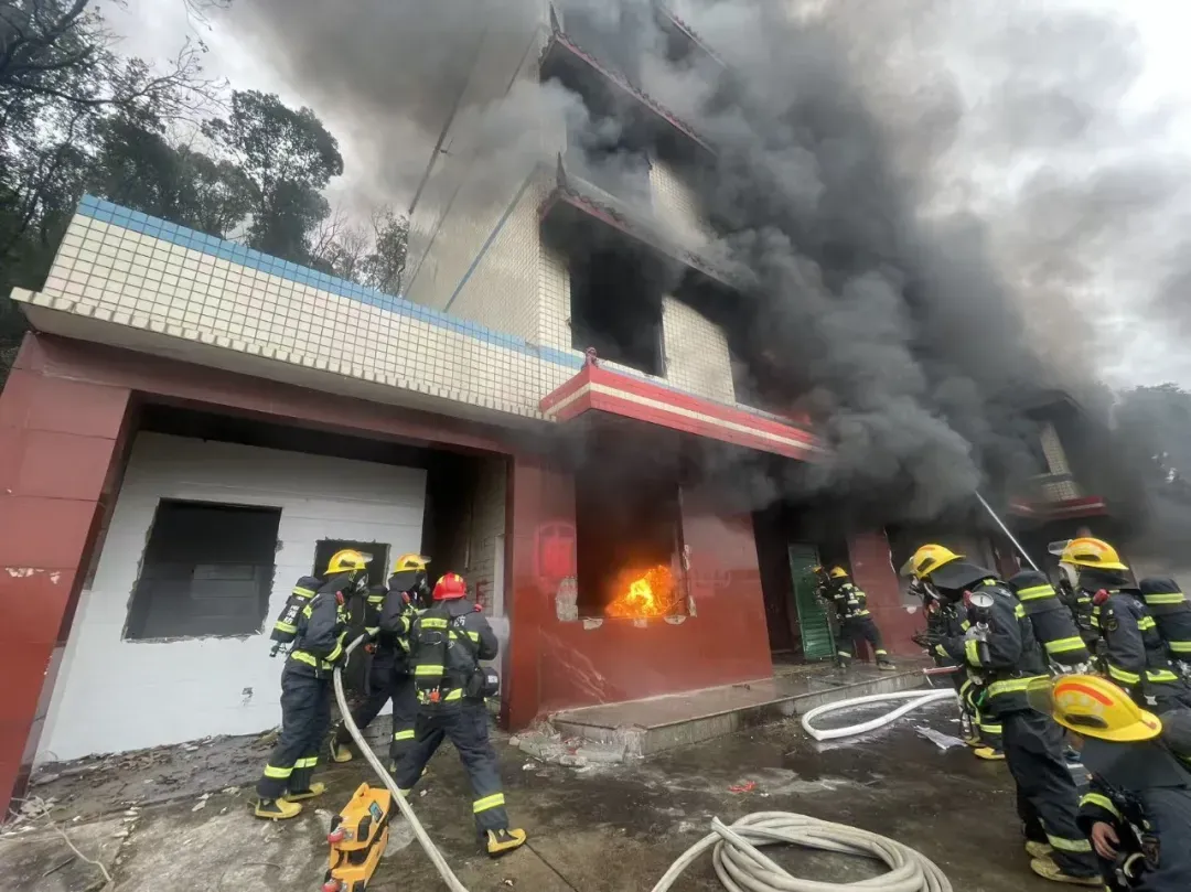 现场模拟一栋四层自建房突发火灾,火势迅速蔓延,1-4层全面陷入猛烈燃烧状态,现场浓烟滚滚、2-4楼有多名群众被困、情况十分危急。