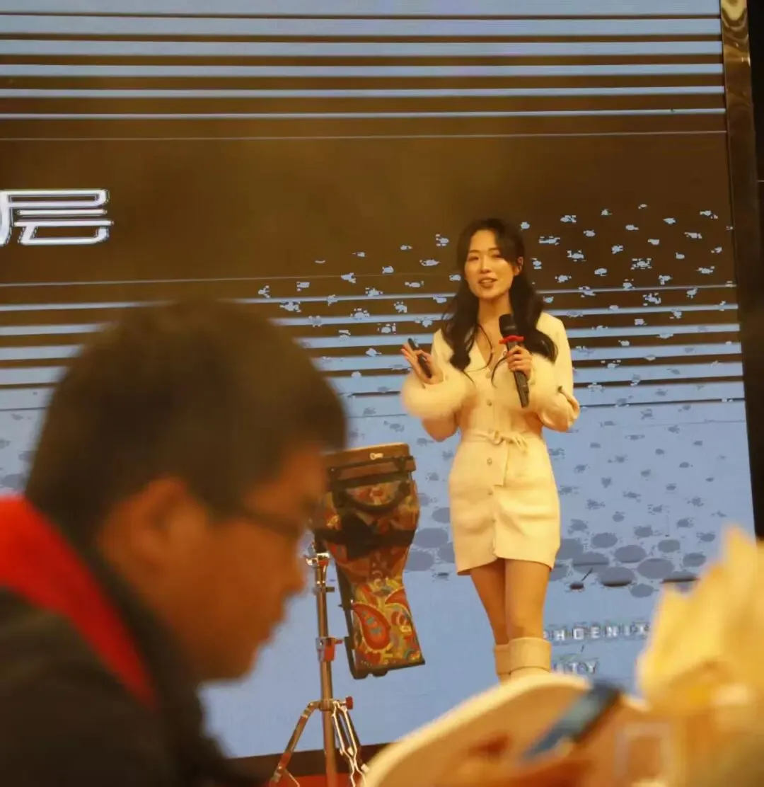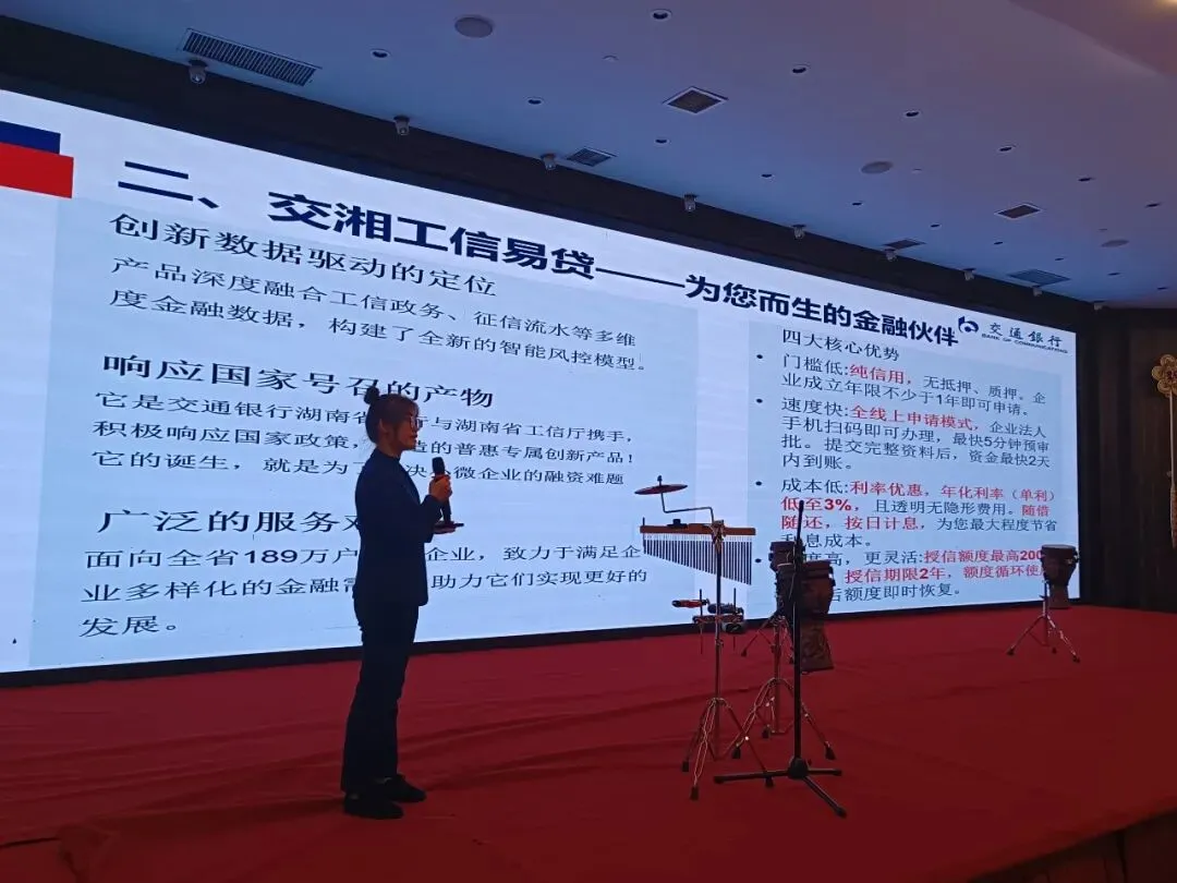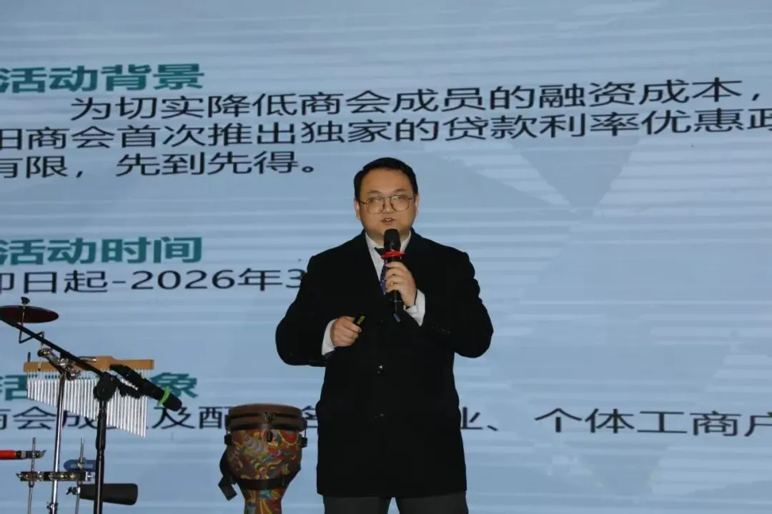 张家界市岳阳商会2026迎新春年会活动安排了银企对接的联谊活动,下图为农业银行紫舞东路支行行长胡蔚在团拜会上为大家介绍优惠信贷业务。
