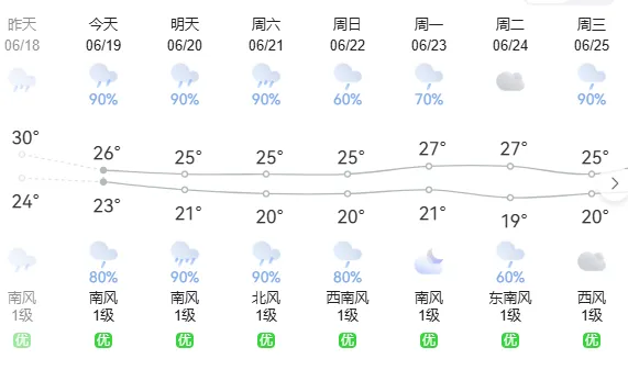 19日17时-20时:中到大雨,累计雨量25~50毫米,南风3~4级,气温25~28℃。