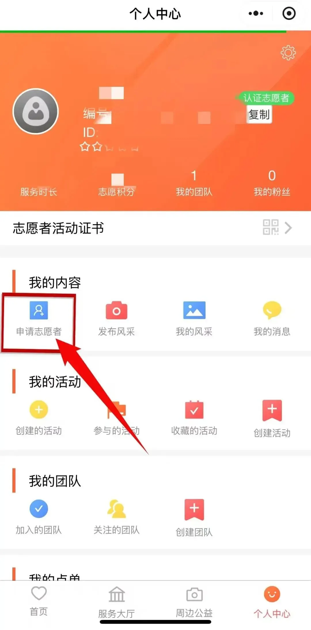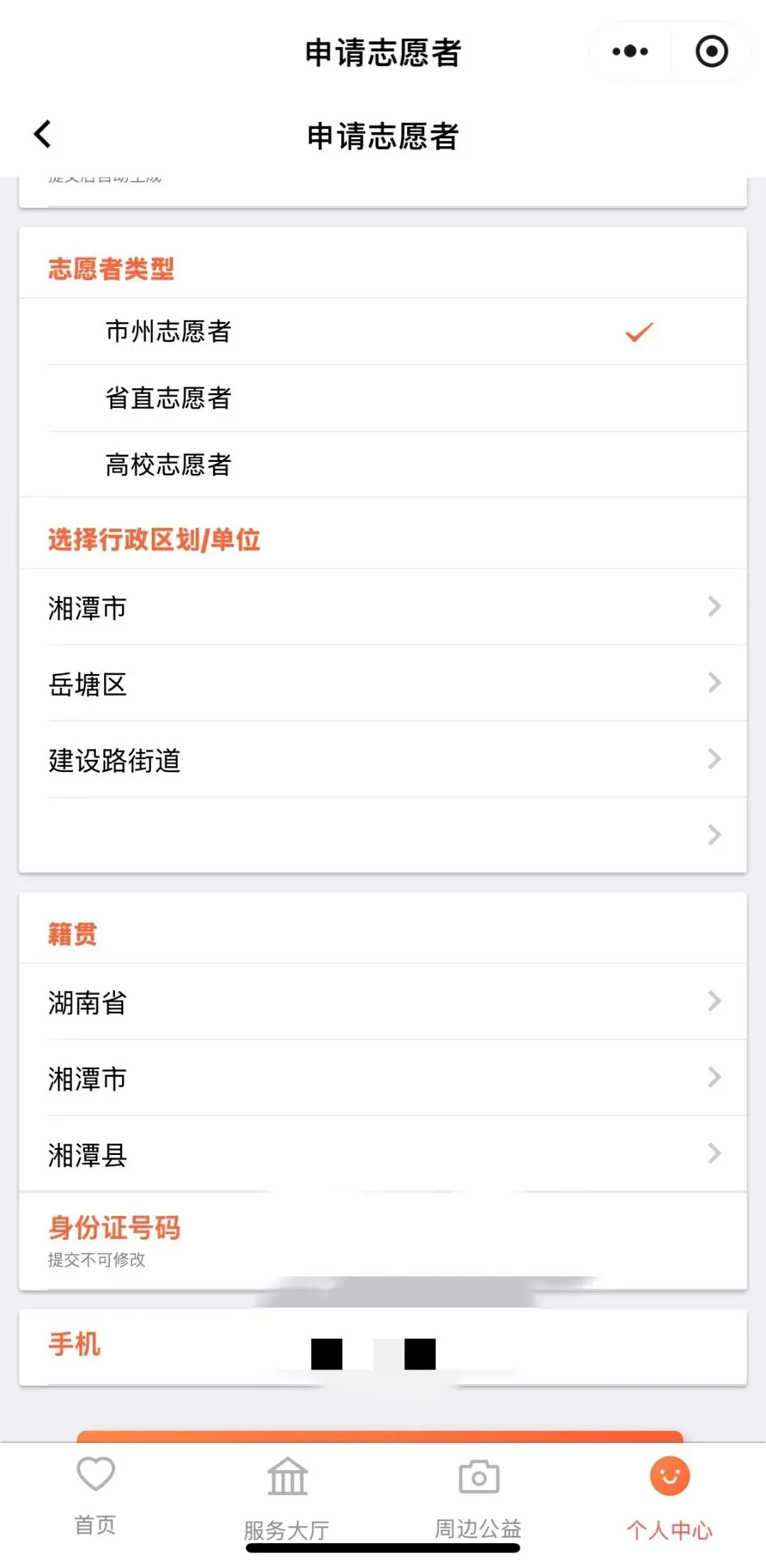 4.实名认证成功后,点击“申请志愿者”填写好志愿者类型(选择“市州志愿者”)、城市、所在地、身份证号码、电话号码。