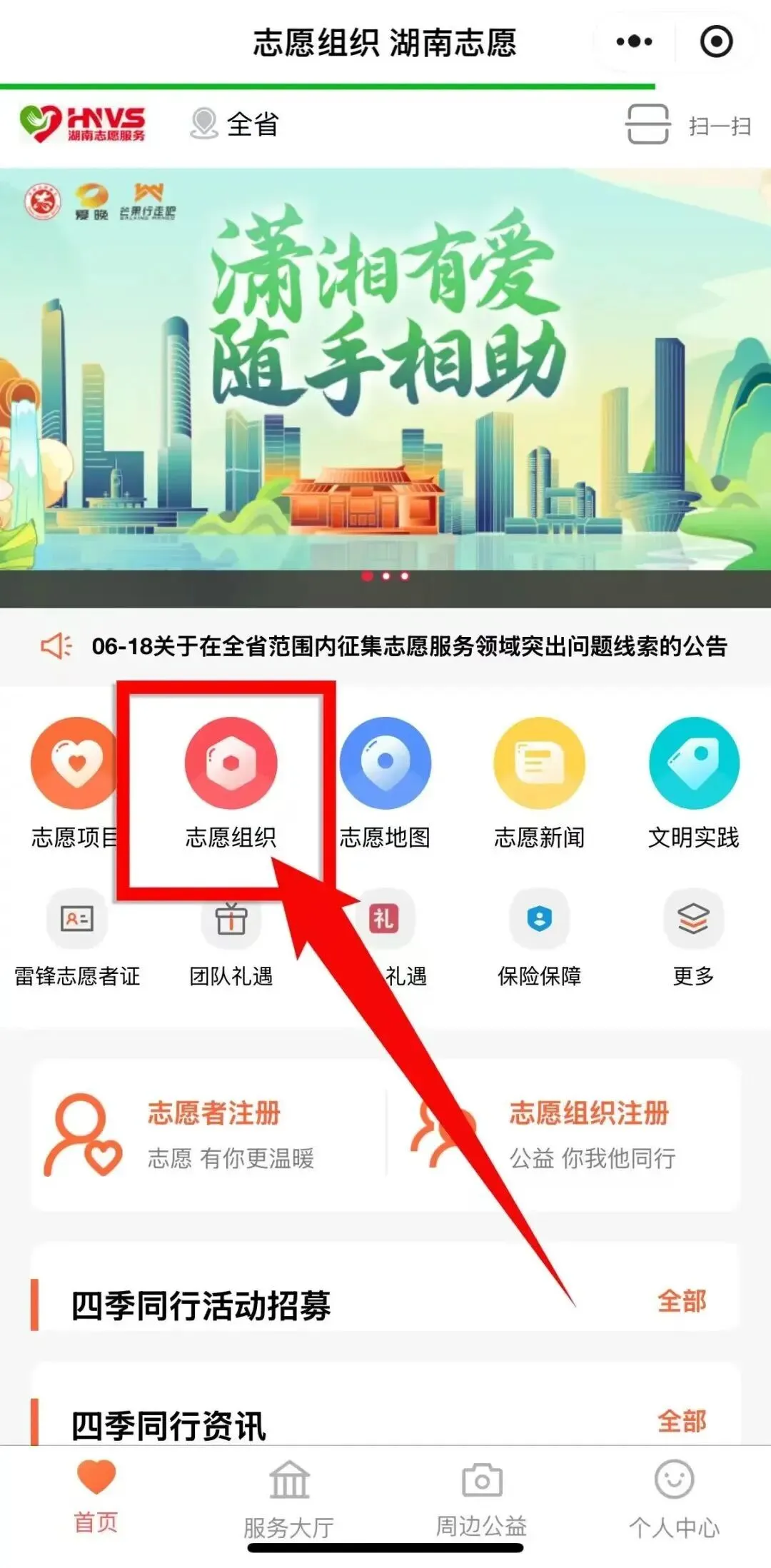 2.打开“湖南志愿”微信小程序点击右下角“个人中心”进行志愿者注册并登录。
