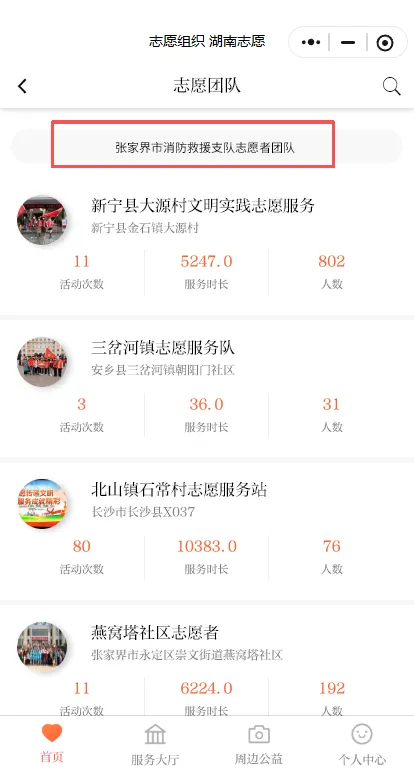 5.回到首页,点击“志愿组织”,搜索“张家界市消防救援支队志愿者团队”。
