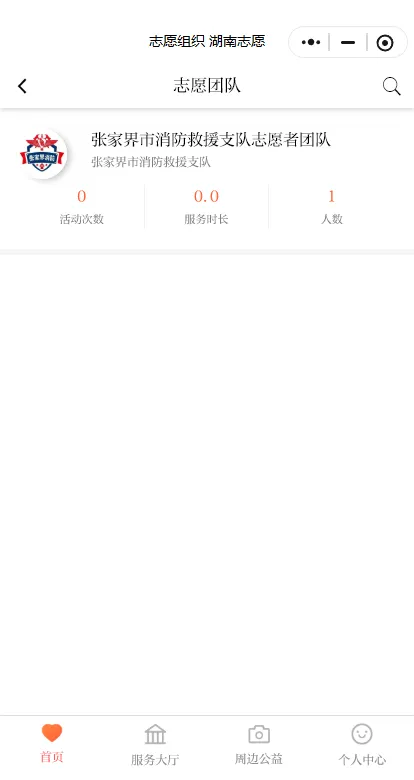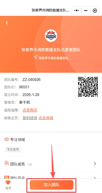 6.点击“张家界市消防救援支队志愿者团队”,进入中心页面后点击右下角“加入团队”等待审核人员同意即可。