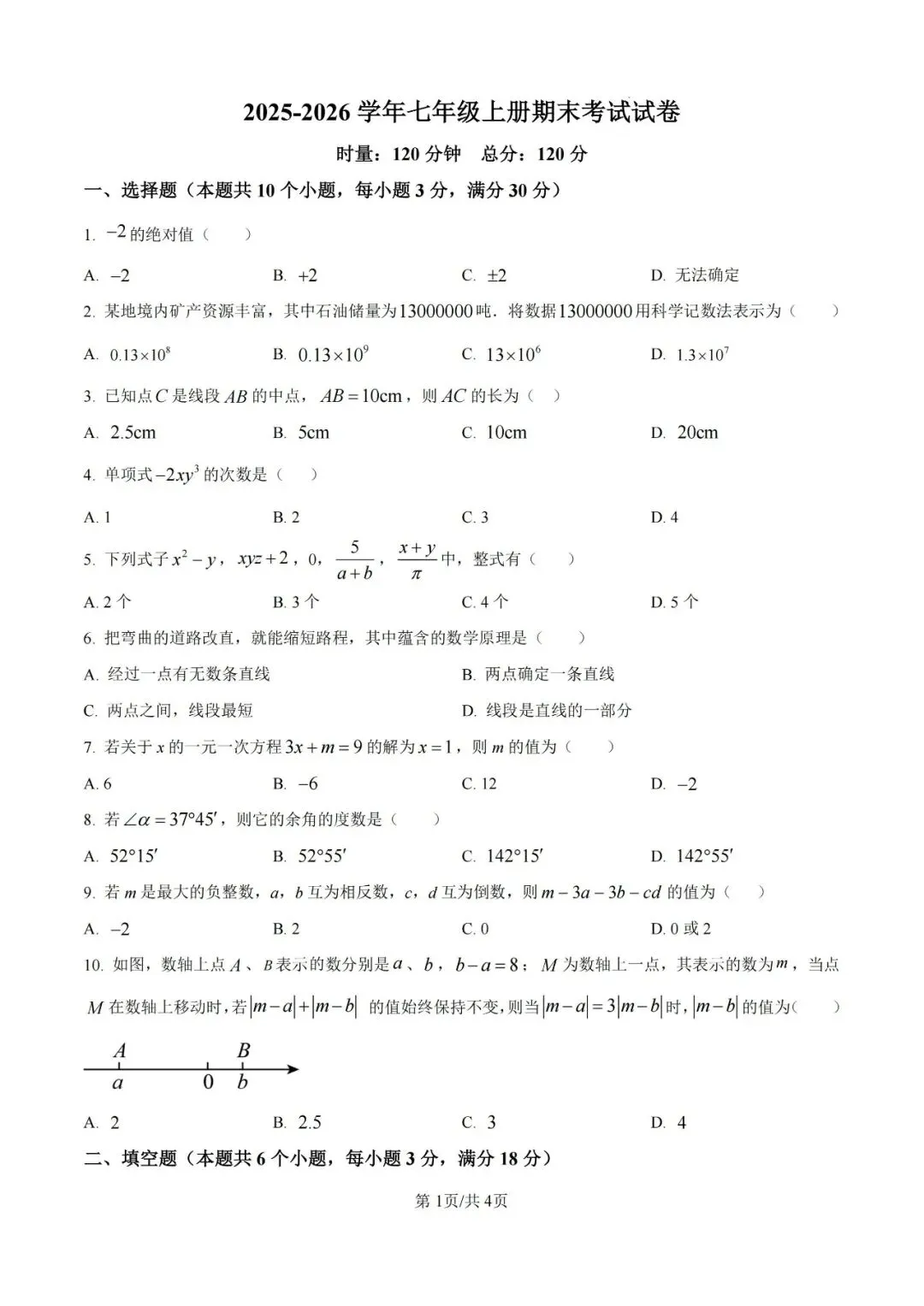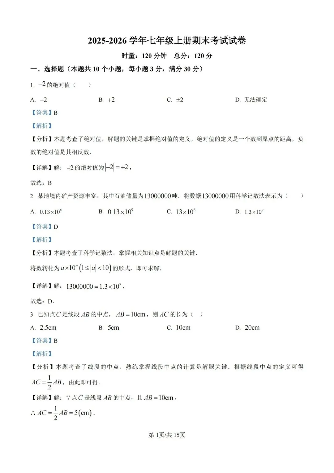 本卷全面覆盖有理数运算、整式加减、几何图形、方程应用等课标核心内容,基础题如绝对值计算、科学记数法转换是主要得分点;难点集中在综合应用题,如第10题需分析数轴上动点距离关系,第24题要求理解新定义'内余角'概念并解决旋转问题,对学生的逻辑推理与创新思维素养提出较高挑战。