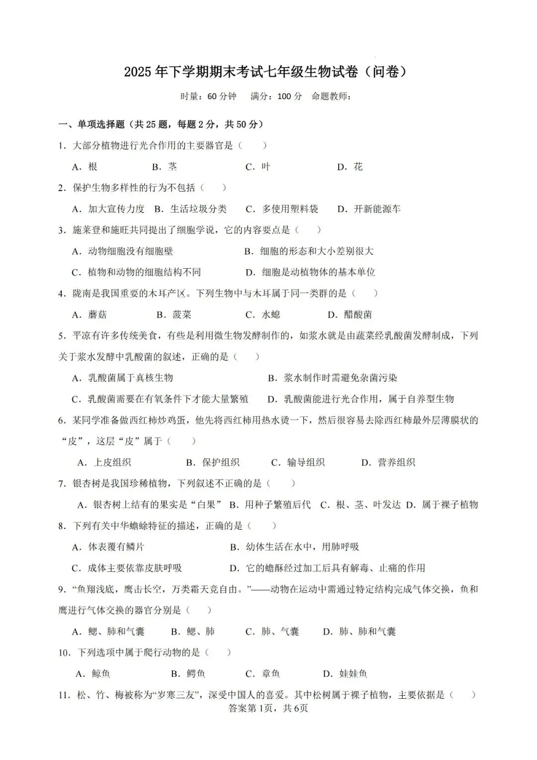 本卷全面覆盖细胞结构、生物分类、生态系统、实验探究等课标核心内容,基础题如光合作用器官判断、细胞学说概念是主要得分点;难点集中在综合应用题,如第26题需区分原核生物与真核生物特征,第28题要求设计对照实验探究维生素C对亚硝酸盐的影响,对学生的科学探究与生命观念素养提出较高挑战。