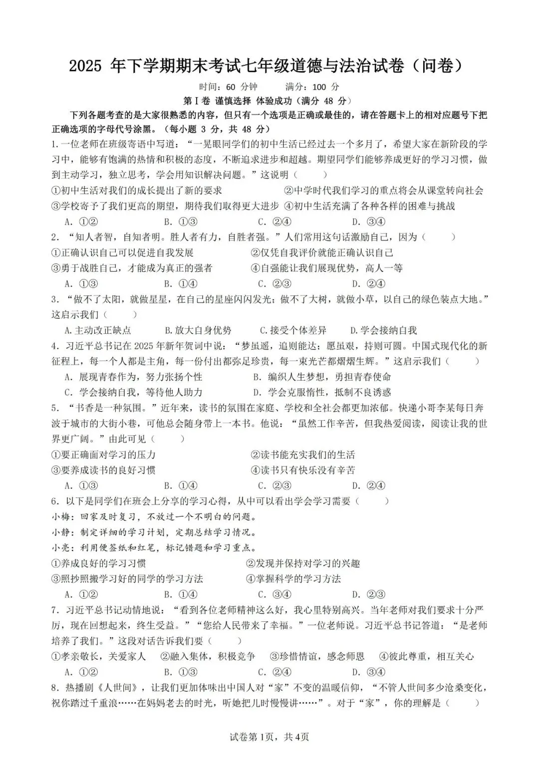 本卷全面覆盖中学适应、认识自我、友谊建立、生命教育等课标核心内容,基础题如学习习惯判断、生命特征识别是主要得分点;难点集中在综合应用题,如第16题需通过多材料分析生命的价值与意义,第20题要求设计集体建设具体方案,对学生的价值认同与公共参与能力提出较高挑战。