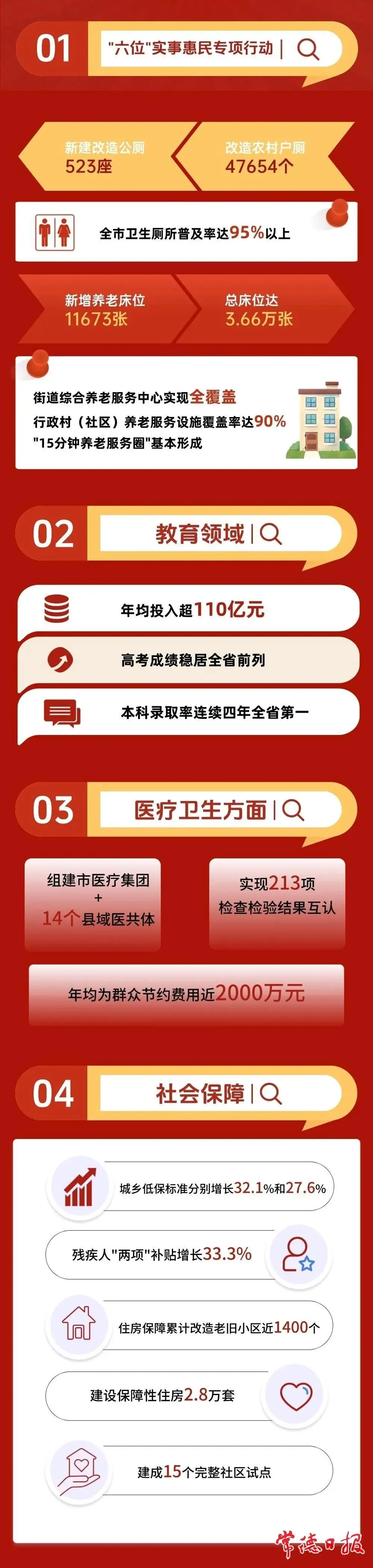 近年来,常德市扎实推进“六位”实事惠民专项行动,新建改造公厕523座,改造农村户厕47654个,全市卫生厕所普及率达95%以上;新增养老床位11673张,总床位达3.66万张,街道综合养老服务中心实现全覆盖,村(社区)养老服务设施覆盖率达90%,“15分钟养老服务圈”基本形成;教育领域年均投入超110亿元,高考成绩稳居全省前列,本科录取率连续4年位居全省第一;组建市医疗集团和14个县域医共体,实现213项检查检验结果互认,年均为群众节约费用近2000万元;社会保障水平持续提升,城乡低保标准分别增长32.1%和27.6%,残疾人“两项”补贴增长33.3%;累计改造老旧小区近1400个,建设保障性住房2.8万套,建成15个完整社区建设试点。