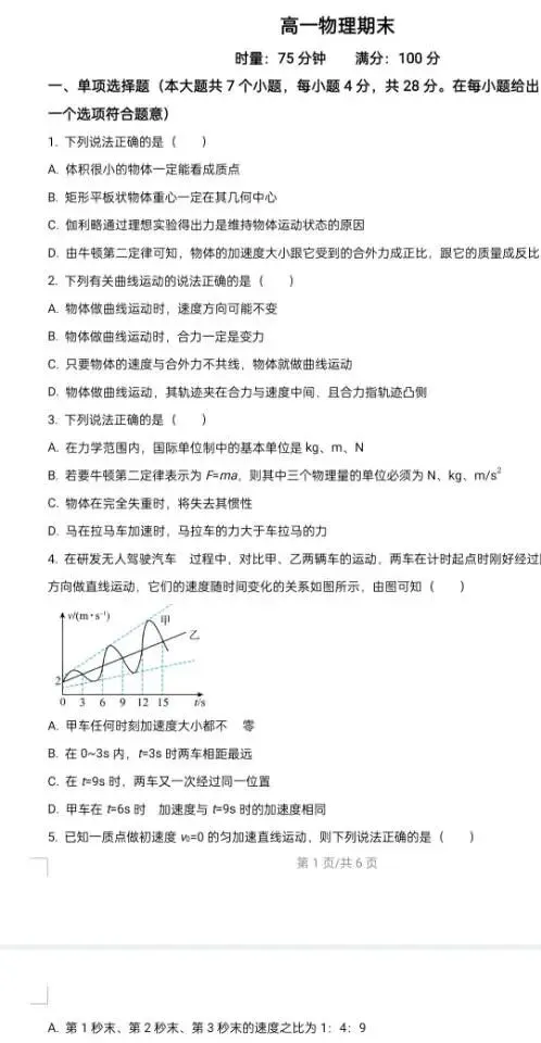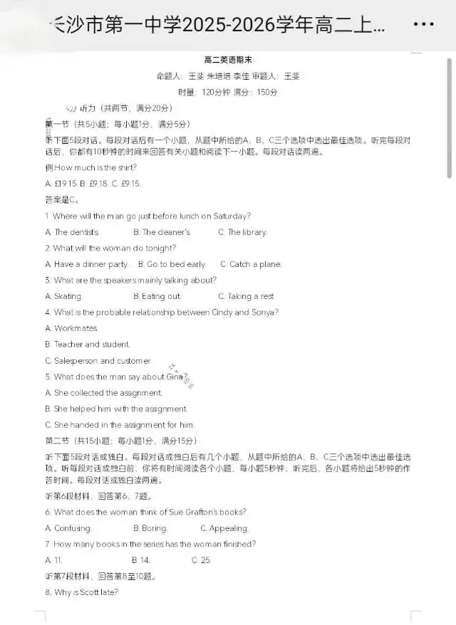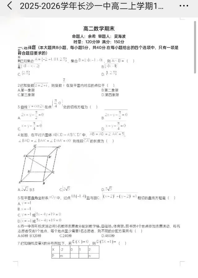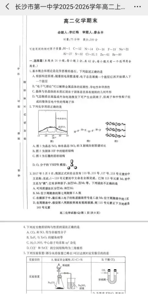 >长沙市一中2025-2026学年高二高一期末考试(部分科目)