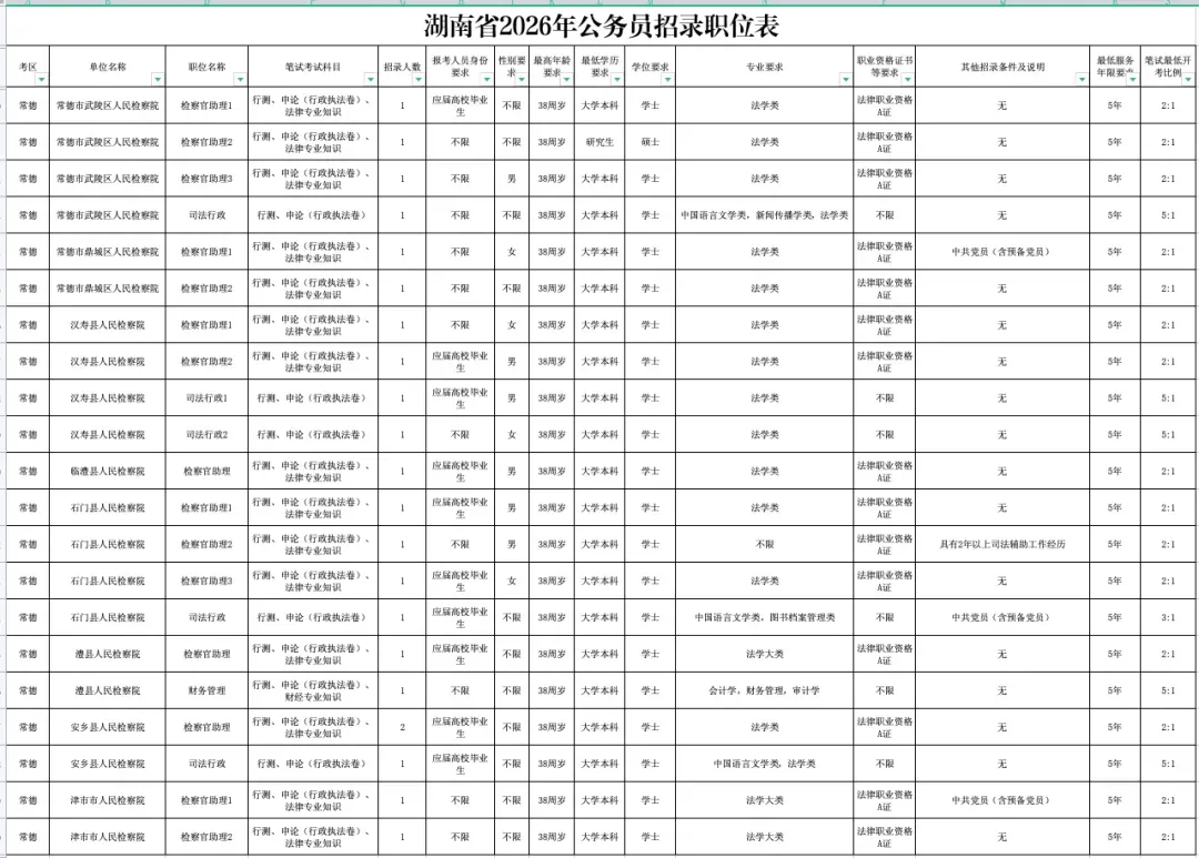 报考人员可通过红星网(http://www.hxw.gov.cn)、湖南人事考试网(http://www.hunanpea.com)或“红星云”“湖南省人事考试院”微信公众号查阅具体的招录单位、职位、人数和报考资格条件。2026年,常德检察机关共8个基层检察院设置招录计划,拟招录22人。