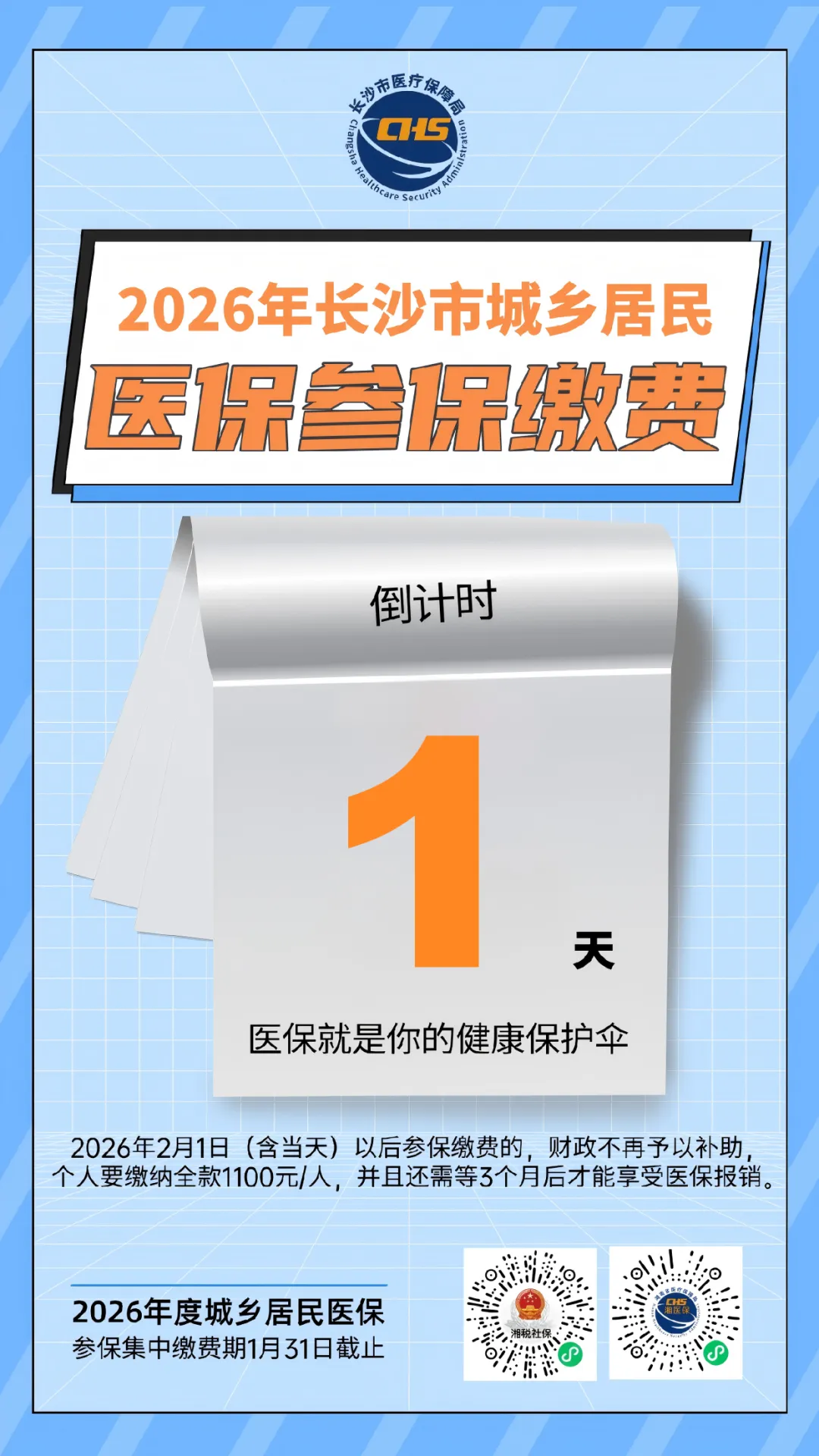 城乡居民医疗保险是一项重要的民生保障制度,关乎着我们每一个人在患病就医时的经济负担和医疗保障。2026年度长沙市城乡居民医疗保险参保缴费只剩下1天啦!