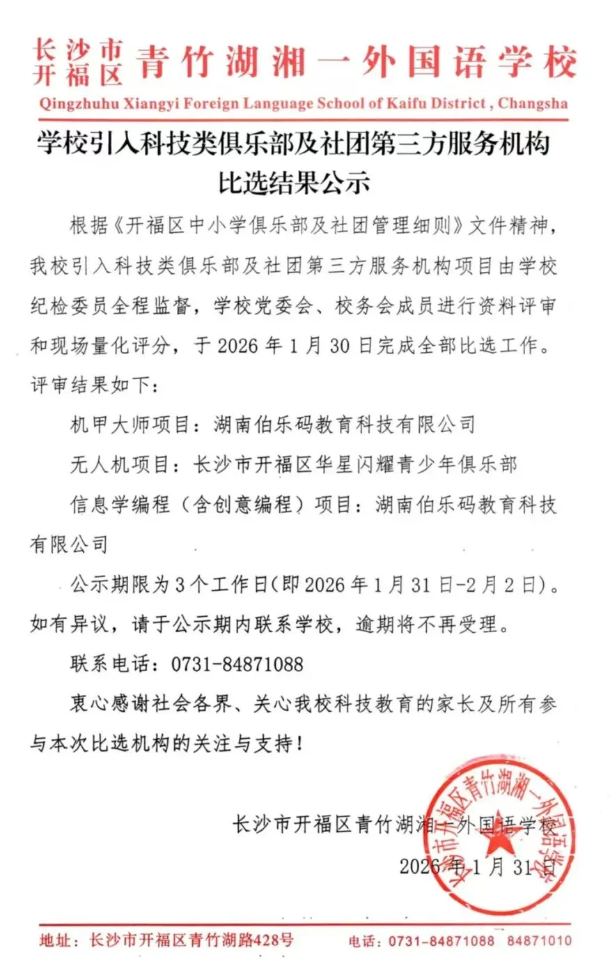 长沙市开福区青竹湖湘一外国语学校引入科技类俱乐部及社团第三方服务机构比选结果公示