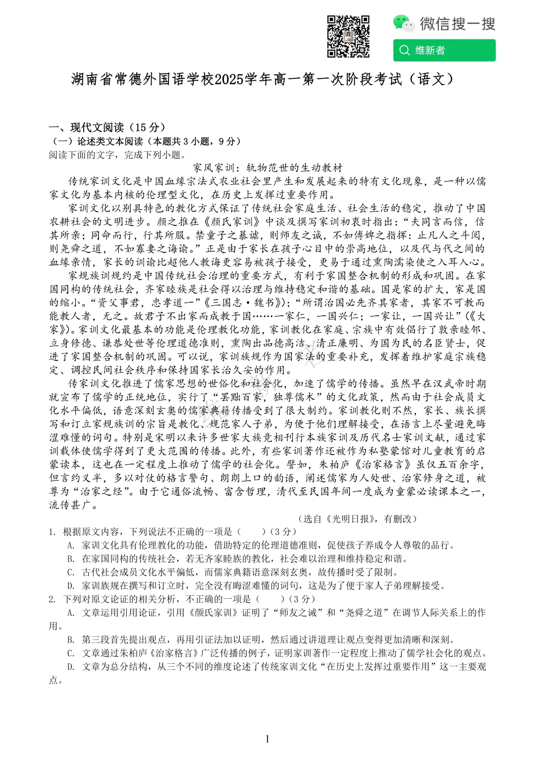 维新者致力于收集和整理各大名校试题,帮助您省心省力获取各类优质的试卷与教辅资源。我们这次带来的是湖南省常德外国语学校2025学年高一下学期第一次阶段性测试语文试题及答案,希望能够有助于您孩子的学习。