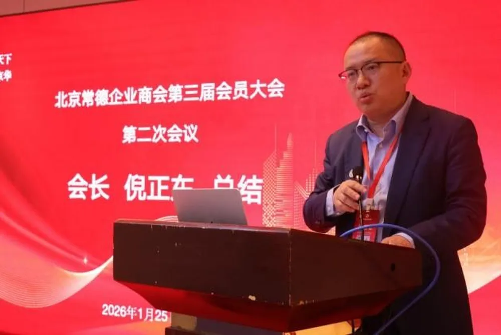 会议接近尾声,会长倪正东发表总结讲话。他首先向本年度为商会发展倾情付出的各位会员、理事、监事、会长、监事长及秘书长表示衷心感谢,正是大家的共同努力让商会蒸蒸日上。随后,他回顾了商会从第二届迈向第三届的发展历程,坚定了持续将商会发展壮大的决心。倪正东会长强调,2026 年商会将继续深入践行“赋能会员”的宗旨,着力提升赋能活动质量,邀请各行业优秀常德籍企业家、投资家为会员答疑解惑、指点发展方向。同时,继续坚守 “助力家乡” 初心,将家乡建设相关工作列为重点,计划在常德召开一次会长办公会,切实推动各项助乡举措落地见效。此外,商会还将邀请更多年轻人加入商会,支持常德青年在京创业。