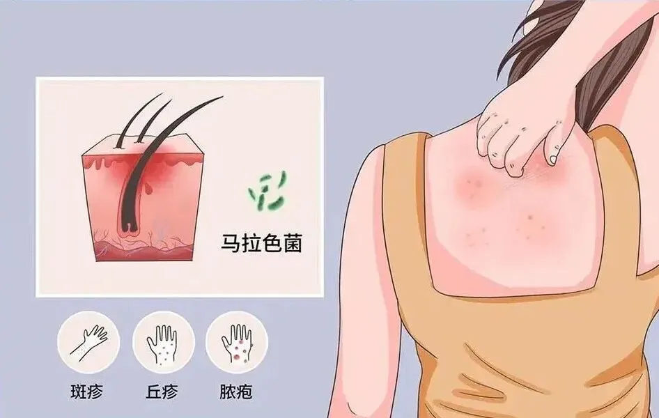 - • 高发区:有毛、易出汗、常摩擦处(头皮、胸背、臀部、大腿根);