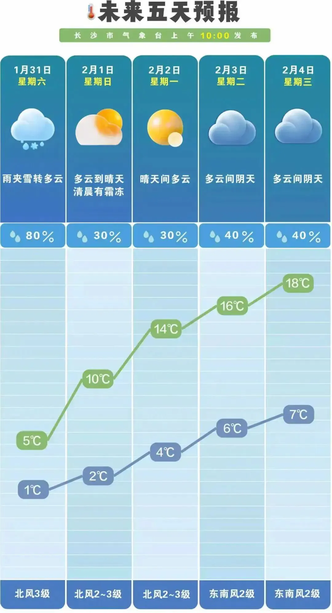 长沙市气象台发布的未来五天天气预报显示,今日(周六)雨夹雪将是主角,最高气温5℃,最低气温仅1℃,凛冽的北风更添寒意。