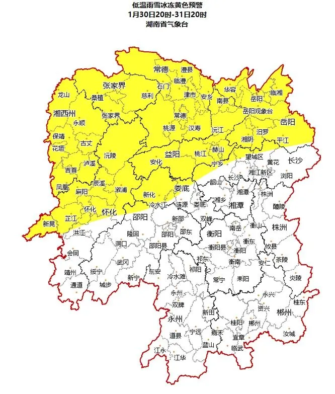 需特别注意的是,湖南省气象台预计,1月31日上午,受冷空气影响湘中以北将出现雪或雨夹雪天气,怀化北部、益阳西部局地中到大雪,1月31日下午过程结束。1月30日,省气象台已发布低温雨雪冰冻黄色预警,预计1月30日20时到31日20时,湘中以北部分地区将出现雨夹雪或雪,且最低气温低于2℃,其中黄色预警区域包括长沙西部、湘西州、张家界、常德、益阳、岳阳、怀化中北部、娄底西部。