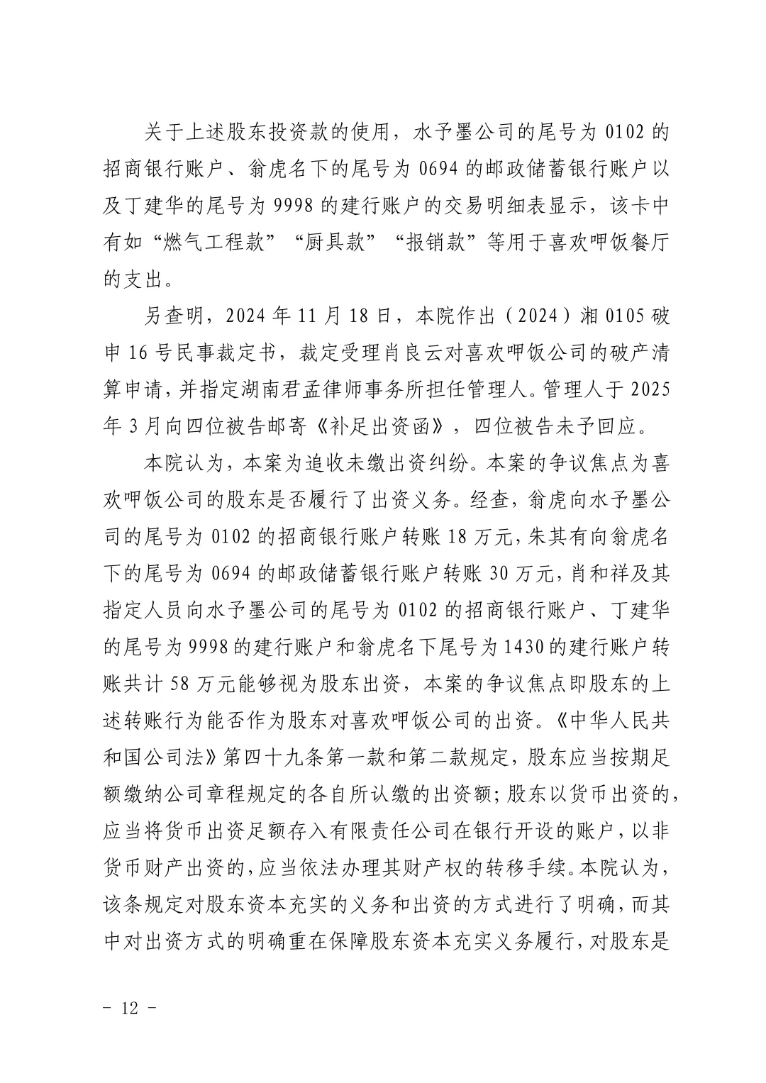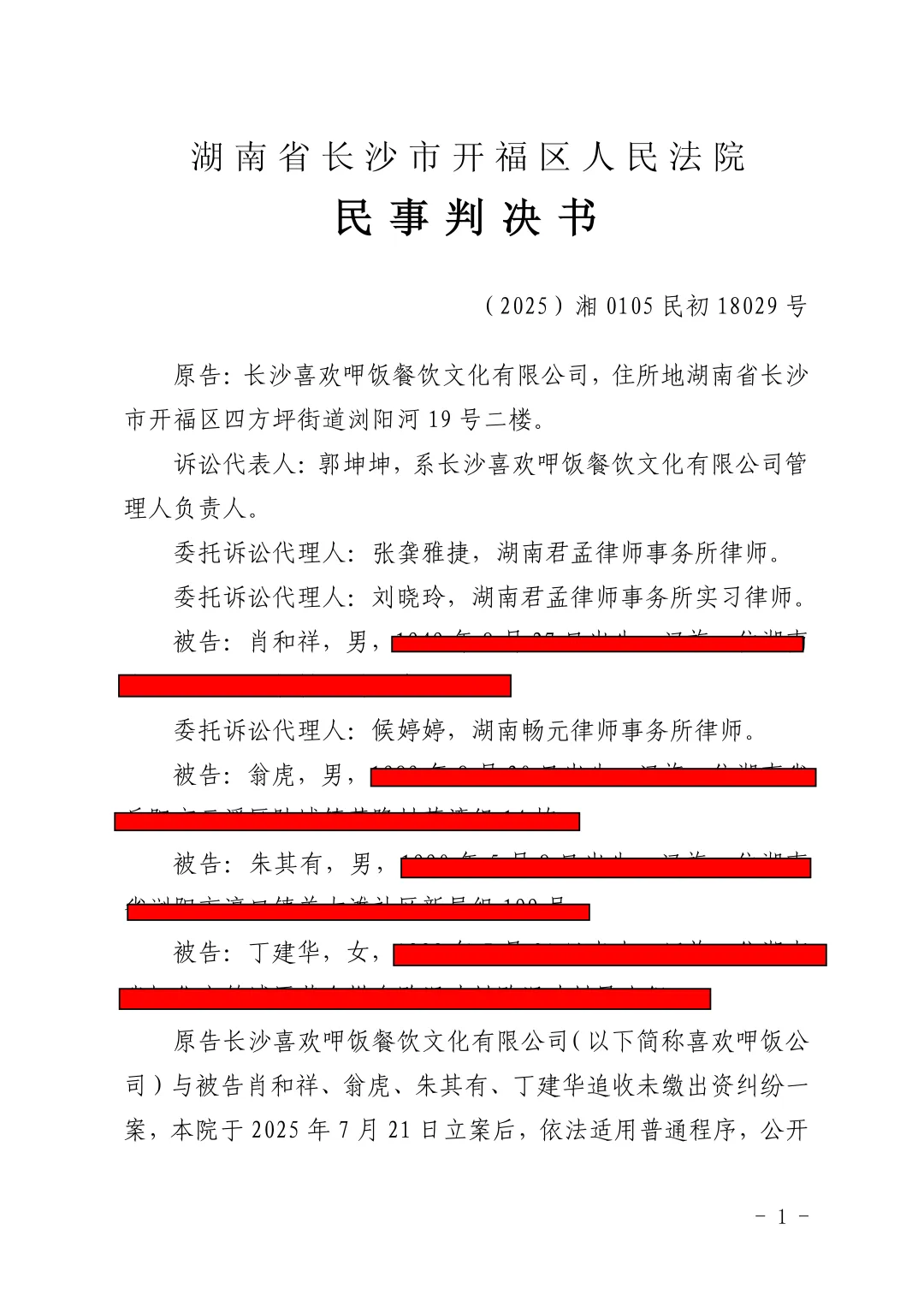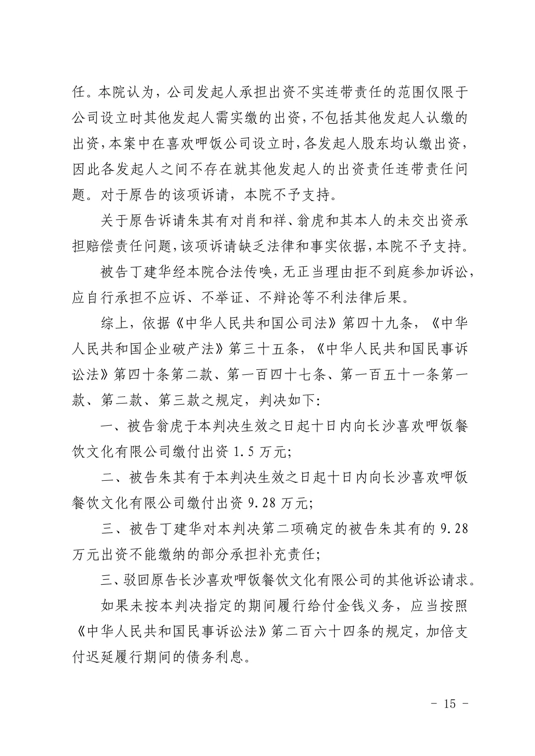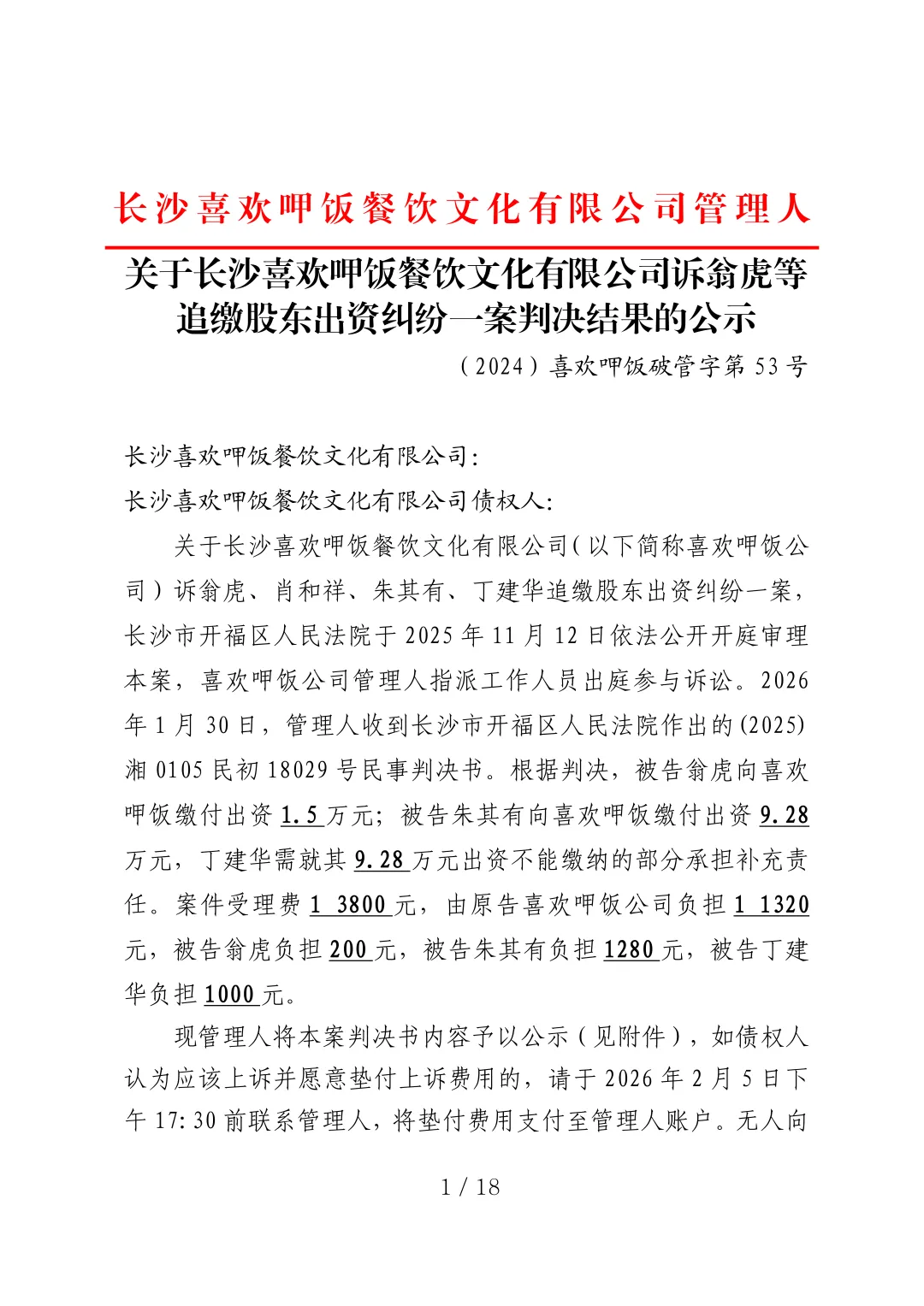 【喜欢呷饭】关于长沙喜欢呷饭餐饮文化有限公司诉翁虎等追缴股东出资纠纷一案判决结果的公示