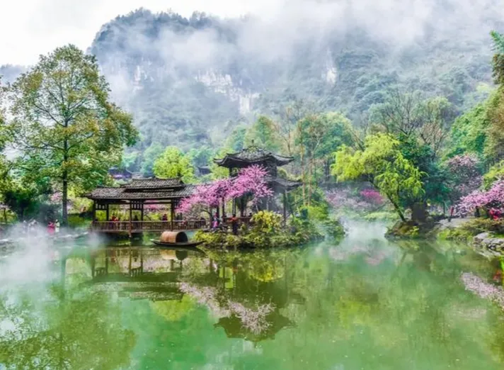 第一站,建议你从桃花源风景区开始。别以为桃花源只是书本里的虚构,这儿的桃花溪真的绕着青山蜿蜒,春日落英飘在水面像粉色的云絮,山像卧着的老者静看岁月,水像缠腰的丝带绕着田埂,风像含着蜜的歌吹过桃林。风里有青草的腥甜,鸟叫声落在溪水里漾开涟漪,光影透过桃树叶在地上织成碎锦。走累了就到山下的农家院歇脚,喝一碗擂茶,就着米粑粑慢慢嚼。这就是常德的'风景逻辑'——看山看水,也看人间。