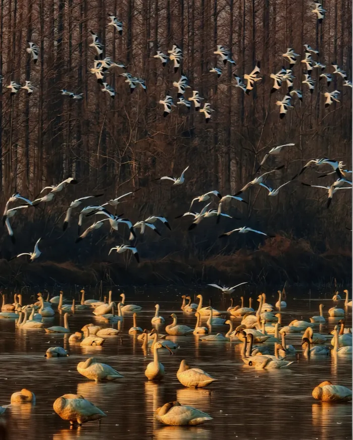 晚霞落在湖面上,像是随手拍的一片金粉。