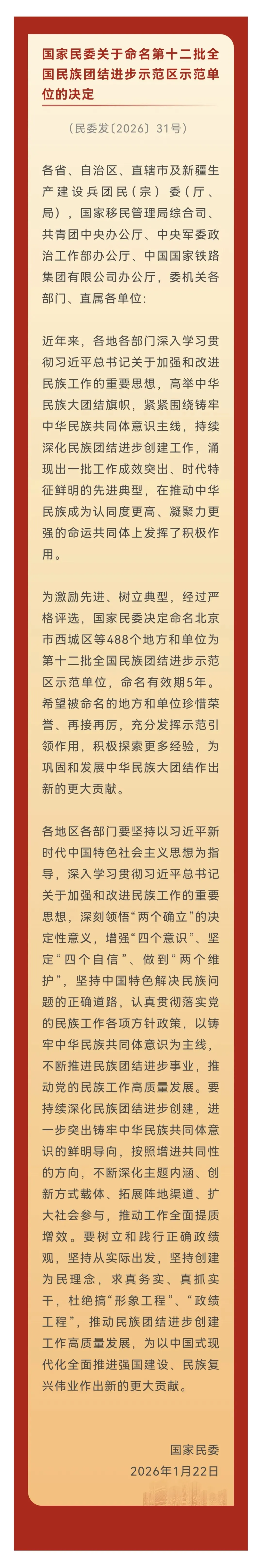 近日,国家民委发布《关于命名第十二批全国民族团结进步示范区示范单位的决定》(民委发〔2026〕31号),雨花区被命名为第十二批全国民族团结进步示范区,是长沙市首个获此殊荣的区县(市)。