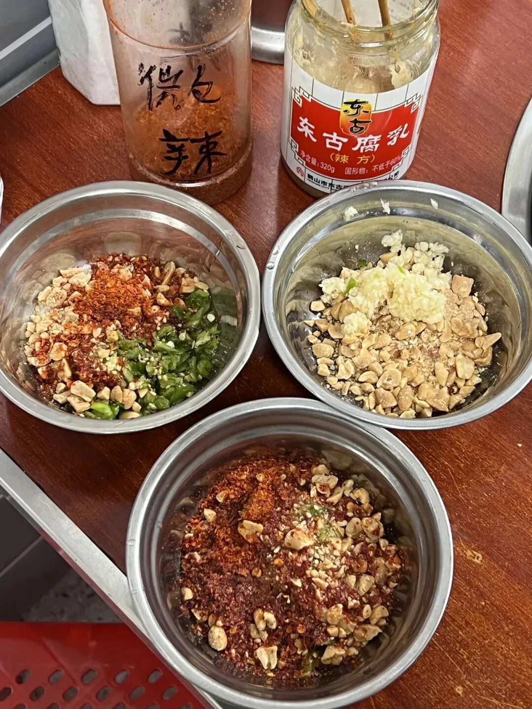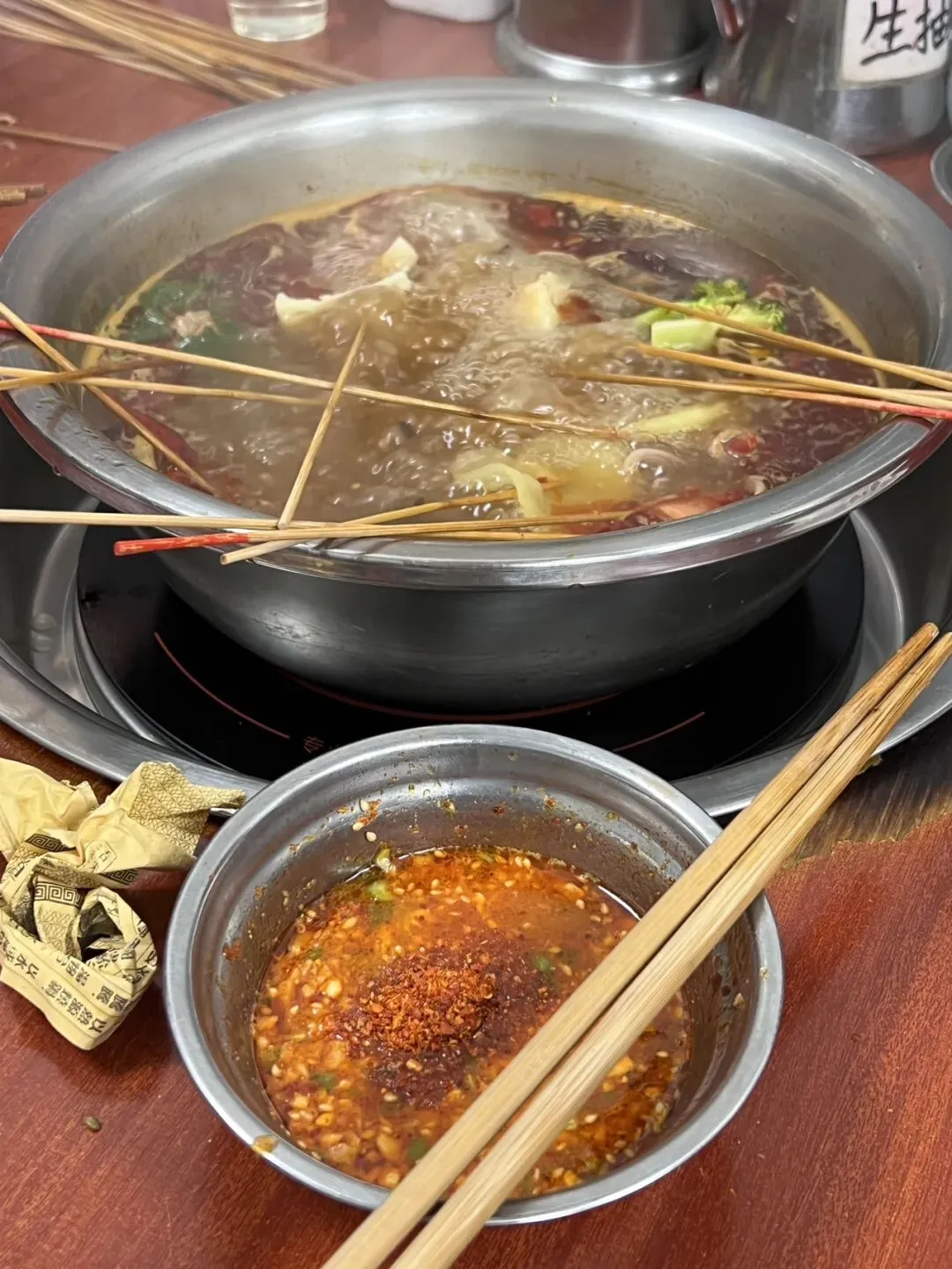 油碟就是他们家一如既往的特色,辣椒粉、花生碎、腐乳、蒜茸......记忆中已经不记得是不是有青椒碎了,整体酱料偏咸,可以多浇点汤拌匀!桌上有辣度不同的粉,看自己需求加!是我喜欢的!没有评价中那样让人失望。花菜、土豆片、小米辣牛肉...印象最深刻的几样,一定要吃!相当韵味。价格有蛮高,串串锅,锅底20块的情况下,食量很小的人均到100了,性价比不高可能就是生意不如以前的原因之一吧......
