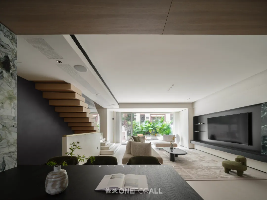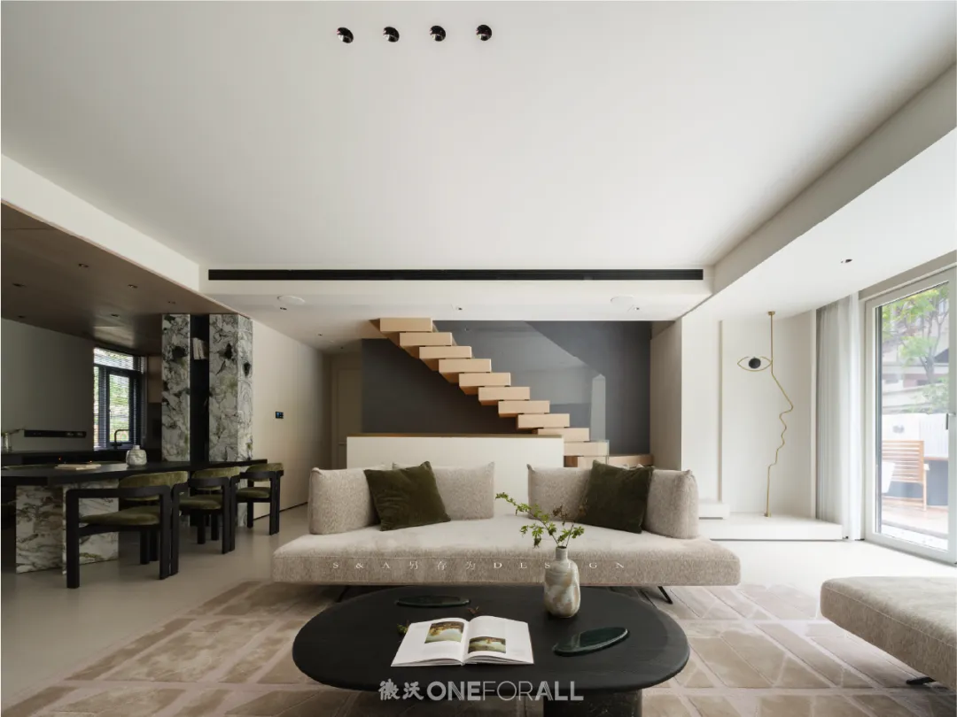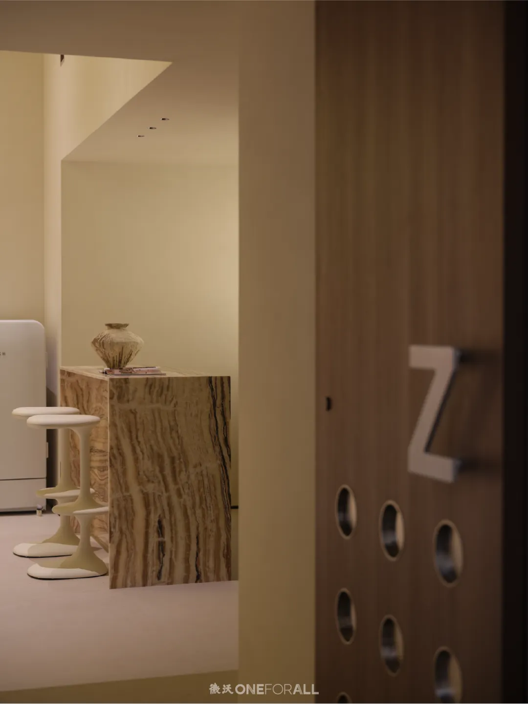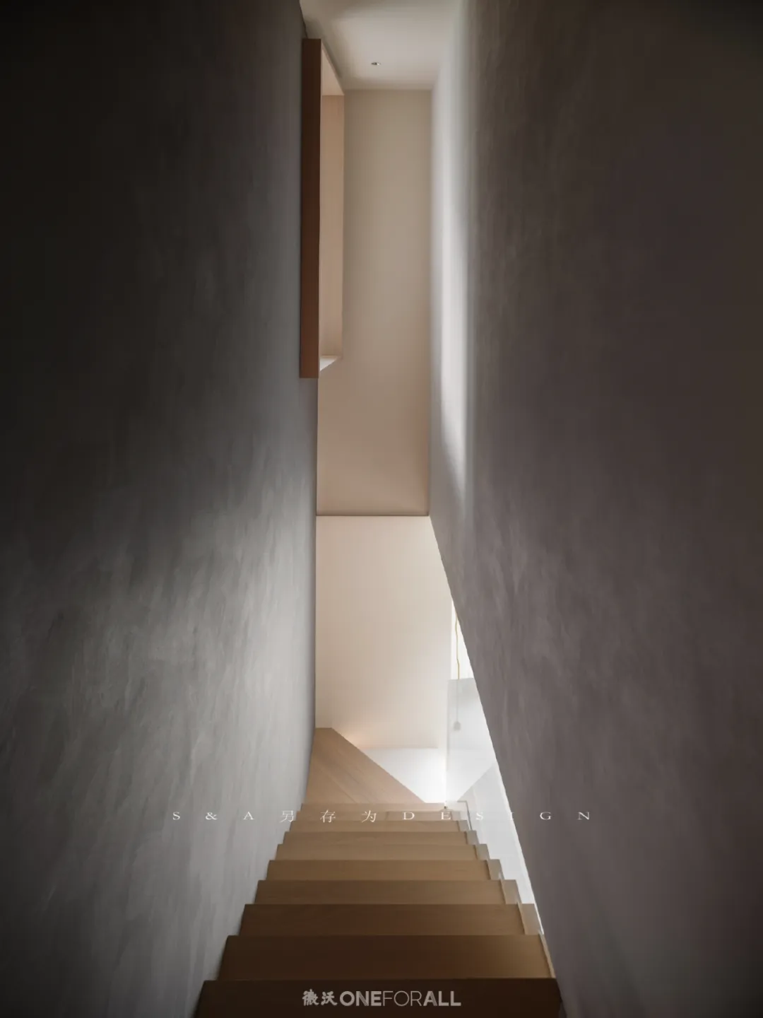 The overall color palette remains unified, yet three materials with distinctly different textures form the foundational layer of the space. As floors shift, the unique textures of the materials, variations in light, and the arrangement of furniture intertwine, each level presenting a completely different spatial atmosphere.