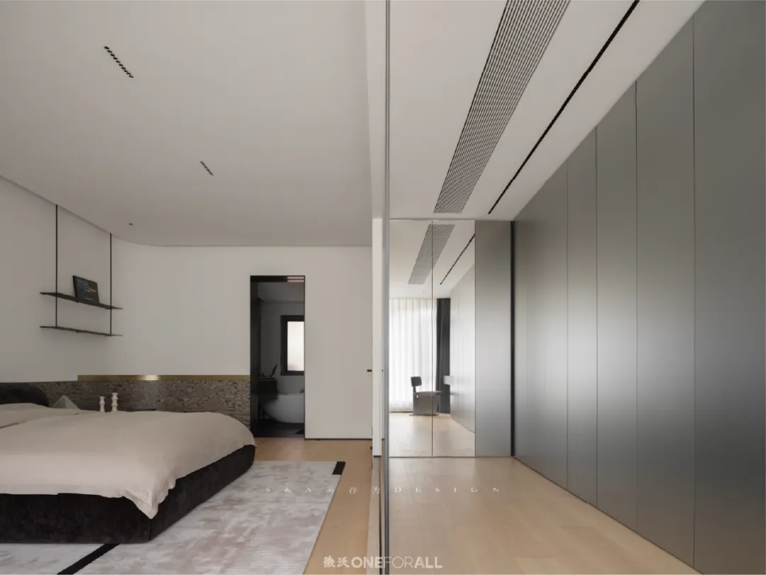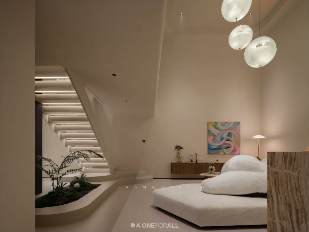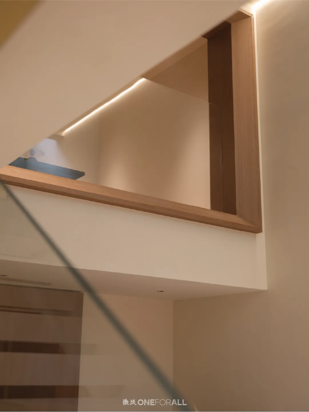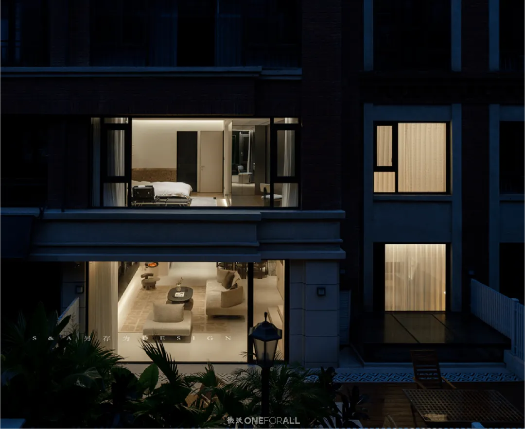 The overall color palette remains unified, yet three materials with distinctly different textures form the foundational layer of the space. As floors shift, the unique textures of the materials, variations in light, and the arrangement of furniture intertwine, each level presenting a completely different spatial atmosphere.