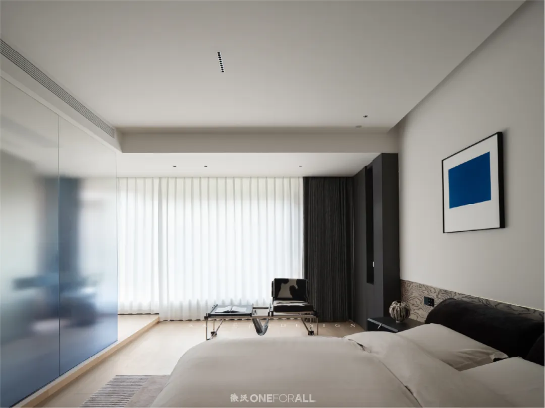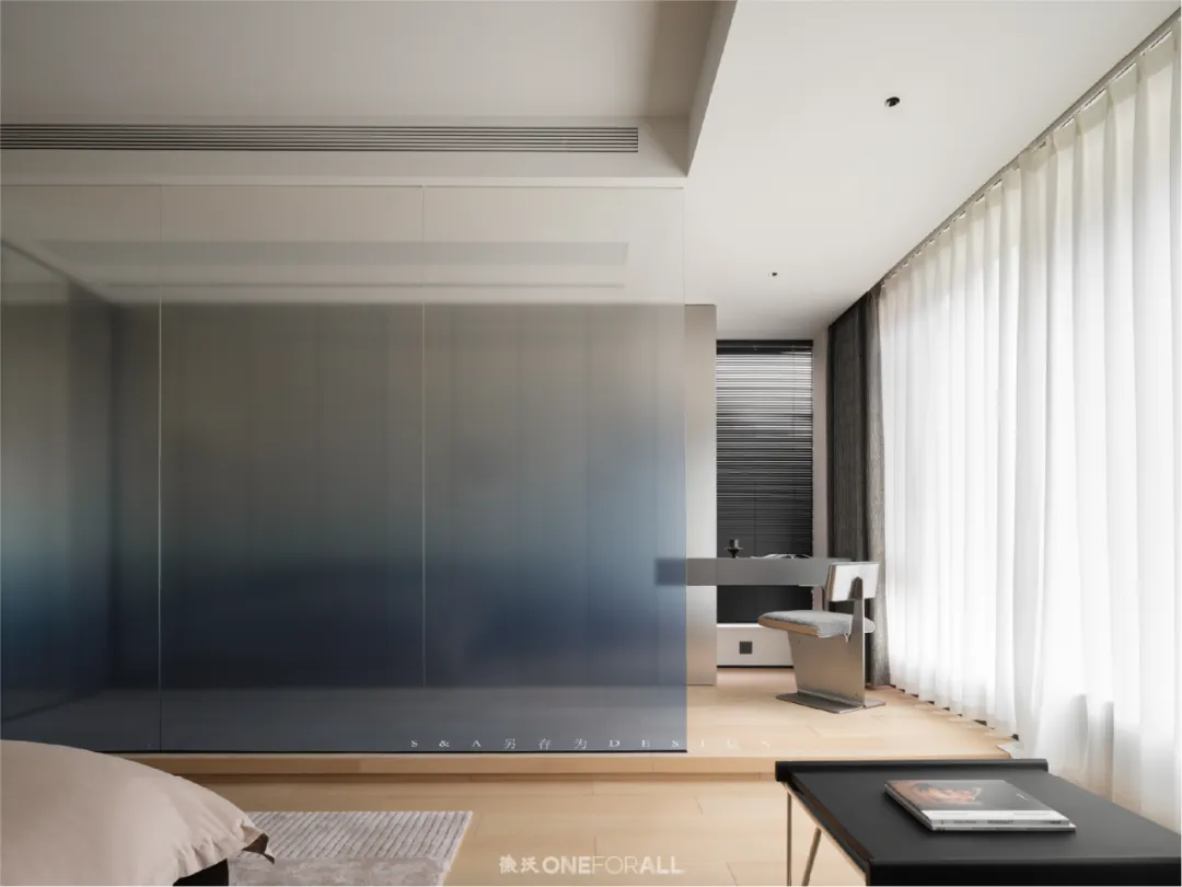 整体的空间采用了简洁的布局和色彩,营造最原始的休憩区氛围。一面蓝调玻璃隔墙打破了这个简洁氛围,在叶隙中与无垠的天空呼应连接,私密却灵动。