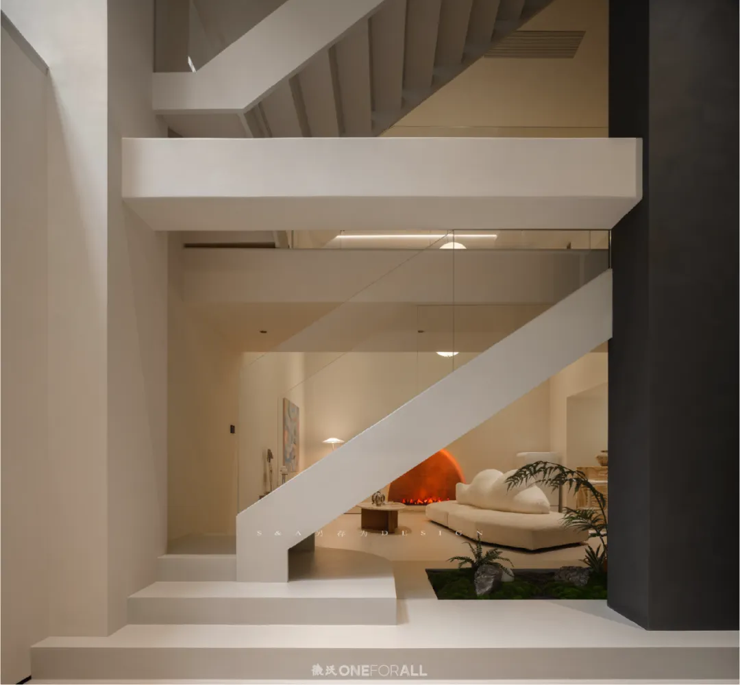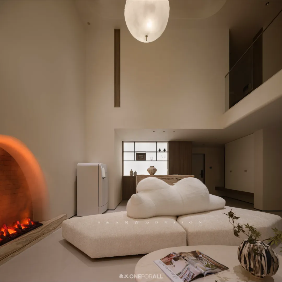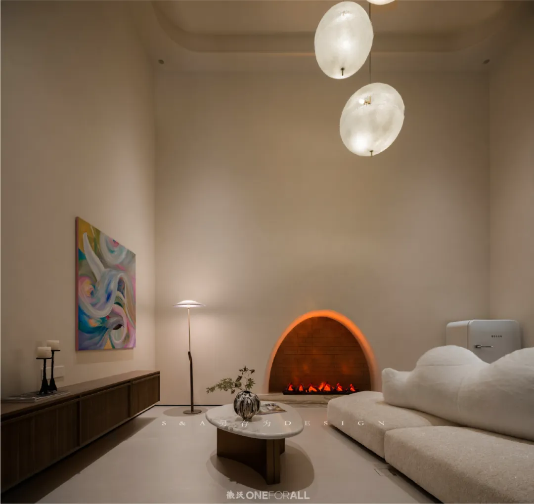 硬朗有序的直线从楼梯踏步开始过渡,弧形墙面搭配软糯毛绒沙发,摇曳的火焰把整个空间烘暖,设计师将地下空间的沉闷感变成了温暖的包裹感。