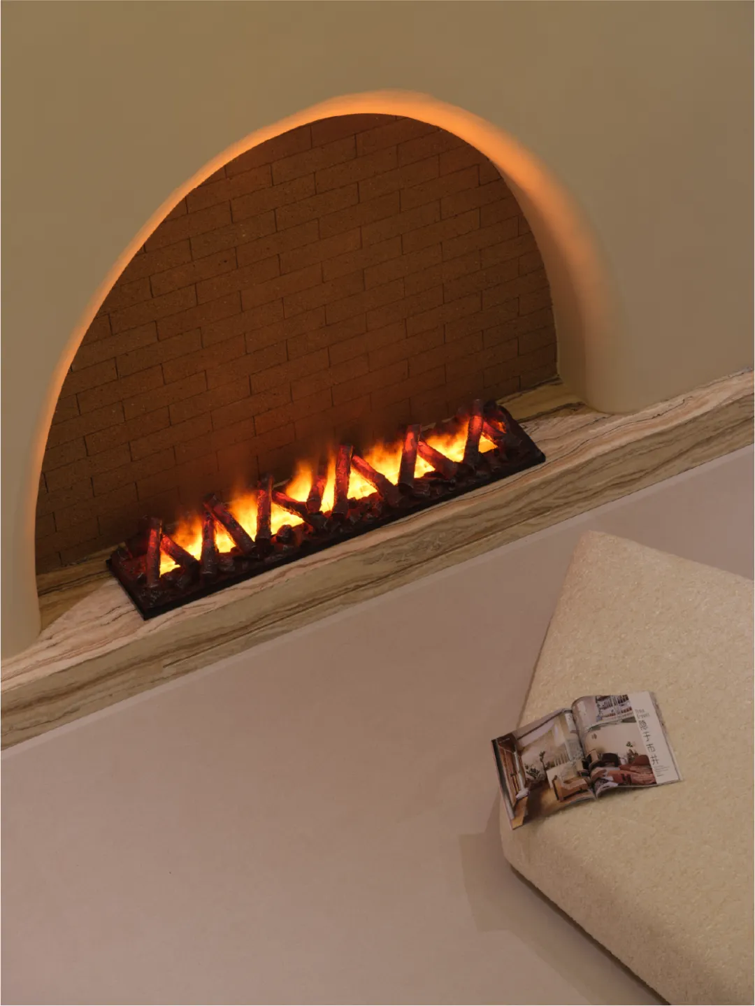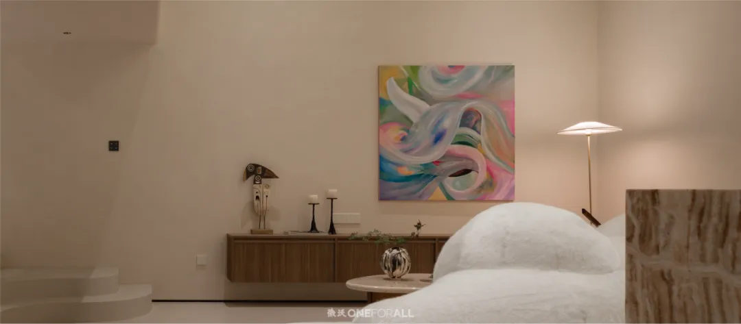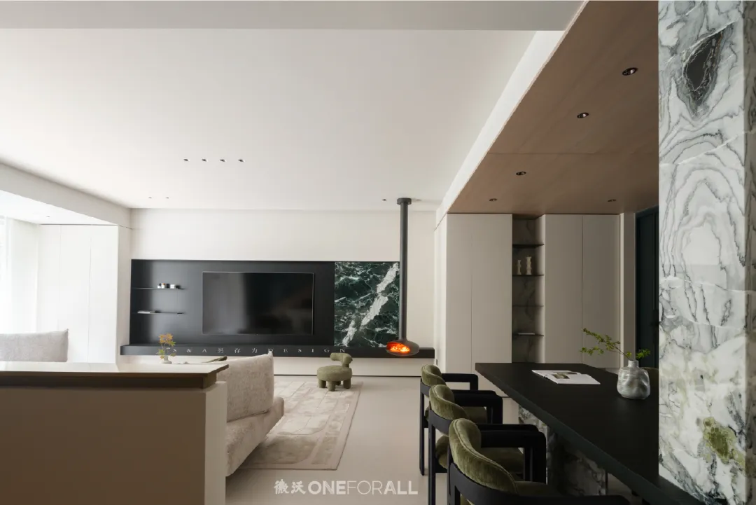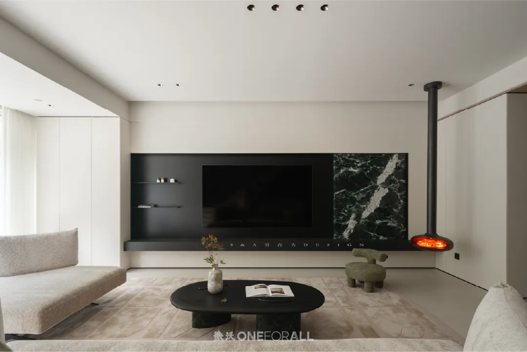 硬朗有序的直线从楼梯踏步开始过渡,弧形墙面搭配软糯毛绒沙发,摇曳的火焰把整个空间烘暖,设计师将地下空间的沉闷感变成了温暖的包裹感。
