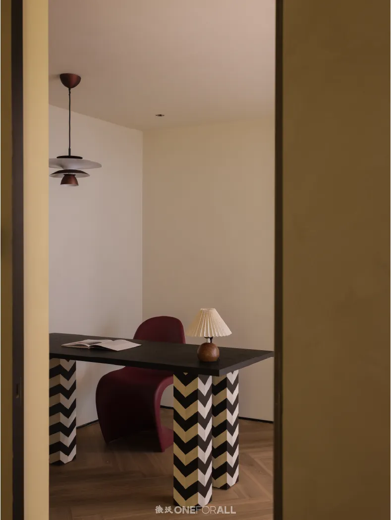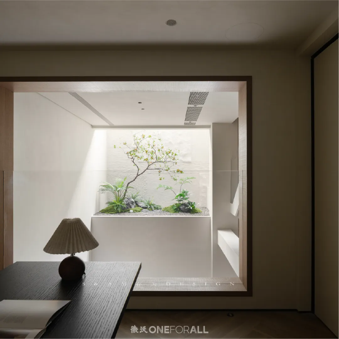 But this enveloping warmth isn't stifling—the study serves as the second breathing point of this space. The courtyard window naturally draws in light, making it a flowing painting, the eye of the underground area, and proof of this fern's growth toward the light.