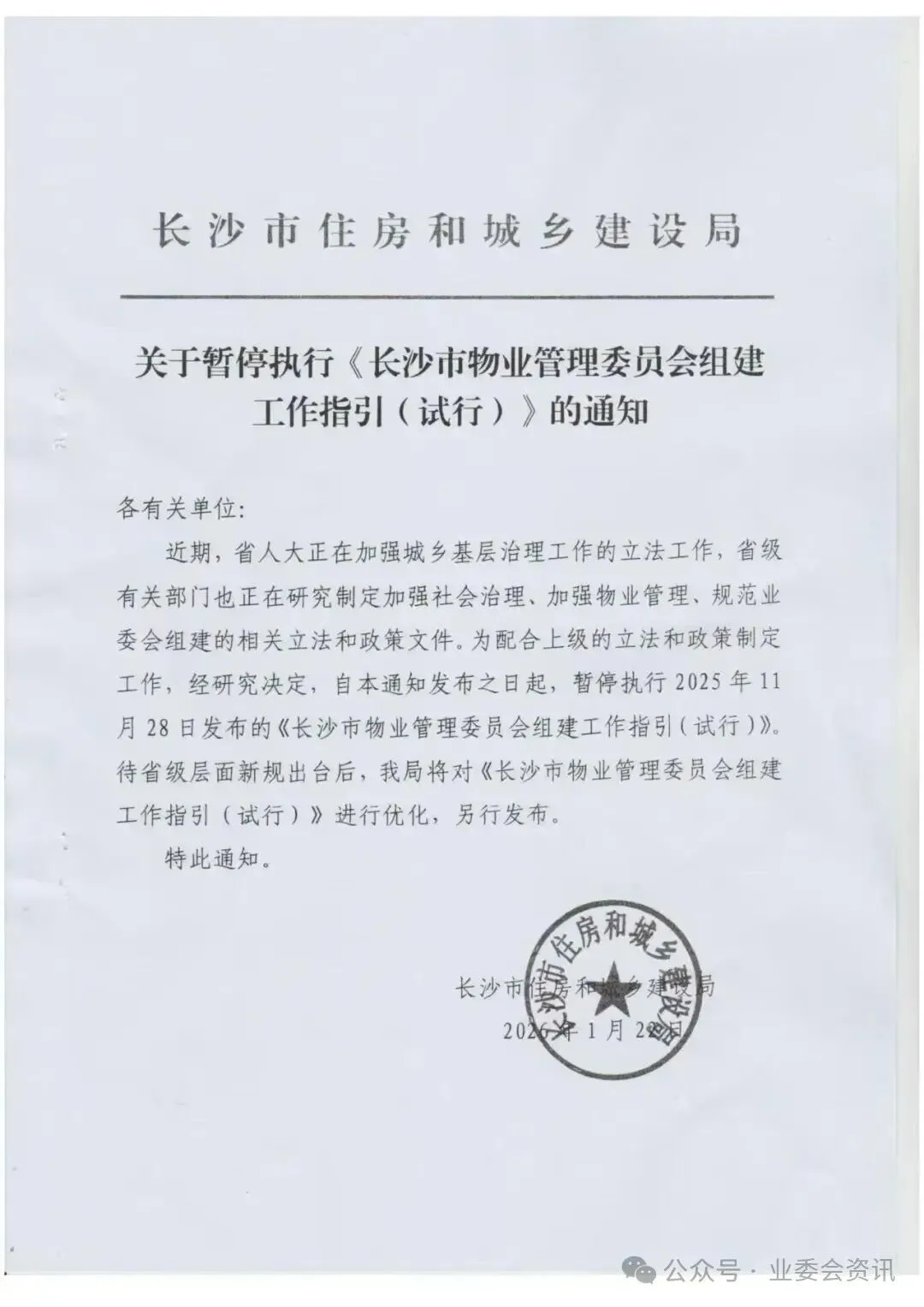2026年1月22日:长沙市住建局紧急发布通知,暂停执行《指引》,理由是“配合省级立法进程”。