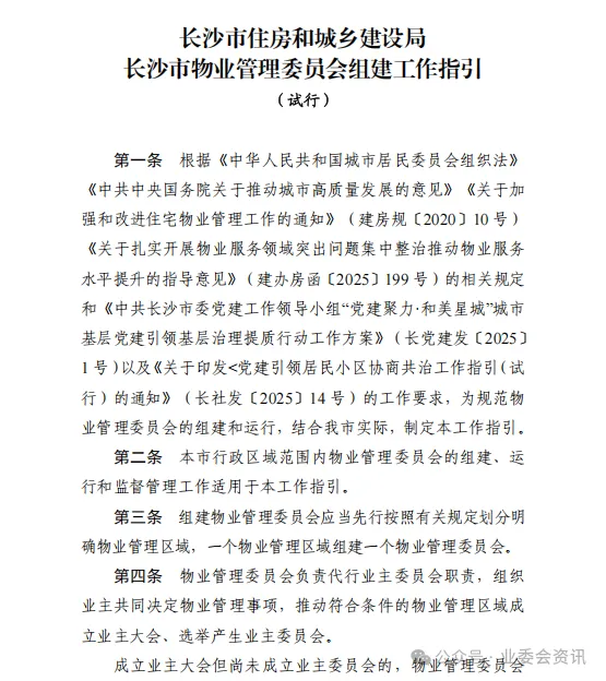 2025年11月28日:长沙市住建局印发《长沙市物业管理委员会组建工作指引(试行)》,提出在业委会难产小区设立由街道主导、党员过半的“物业管理委员会”,作为过渡性治理主体。