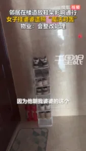 当事人熊女士称,邻居从去年夏天开始就在楼道摆放鞋架,楼道较窄,自己长期在外地奔波,偶尔回来住,带着行李把鞋架撞倒还得帮忙捡鞋,觉得非常恶心,投诉后物业上门处理过,对方表示家里放不下,自己建议可以在电表箱那打个鞋柜不凸出来就行,已经做出让步,但对方就是不改,后来双方老公起了小争执,只好把去世婆婆的遗照挂在楼道墙上“魔法对轰”,对方报了警,警方也是让把鞋架拿进去,他们就是不拿,事后还在遗照上扔鸡蛋,老公一气之下踹散鞋架,对方又报了警,虽然现在已经收拾了,但门口还放了双鞋,目前还在僵持中。