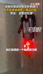 1月28日,湖南张家界。邻居在楼道放置鞋架影响通行,多次投诉无果,女子将婆婆遗照挂楼道反击。