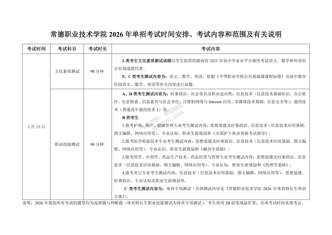2026年单招考试大纲-常德职业技术学院