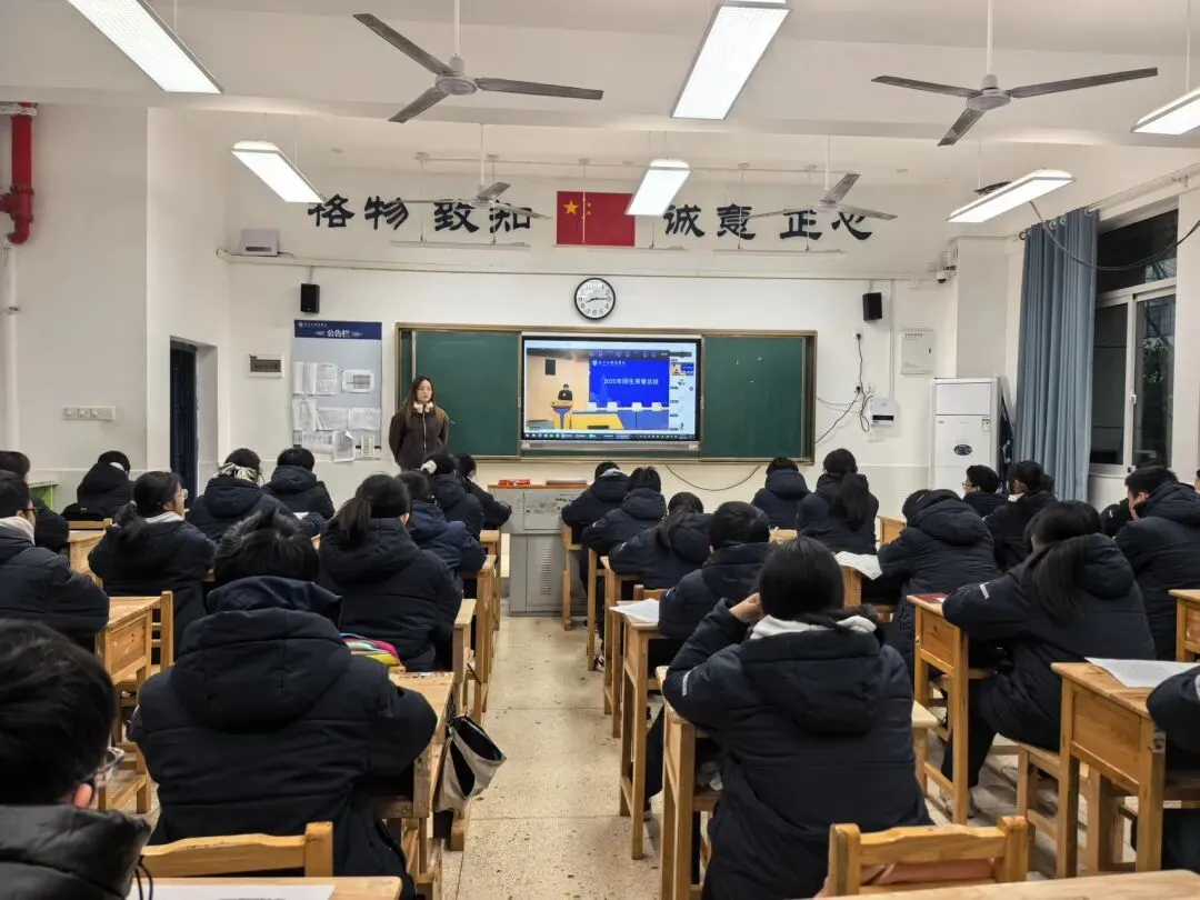 随后,主持人范震详细解读寒假放假及开学相关安排。根据学校放假部署,各年级已于1月30日有序离校,正式进入寒假;全体学生需于2026年3月4日上午8:00前返校报到,下午正式上课,3月5日举行开学典礼。同时,他对假期学习生活提出具体要求:希望同学们制定科学计划,每天预留1-2小时集中学习时间;每天至少30分钟体育锻炼,主动承担家务;规范手机使用,控制使用时长,坚守网络文明底线,保护个人信息安全;丰富精神生活,多读书、参与兴趣活动,共度温馨亲子时光。