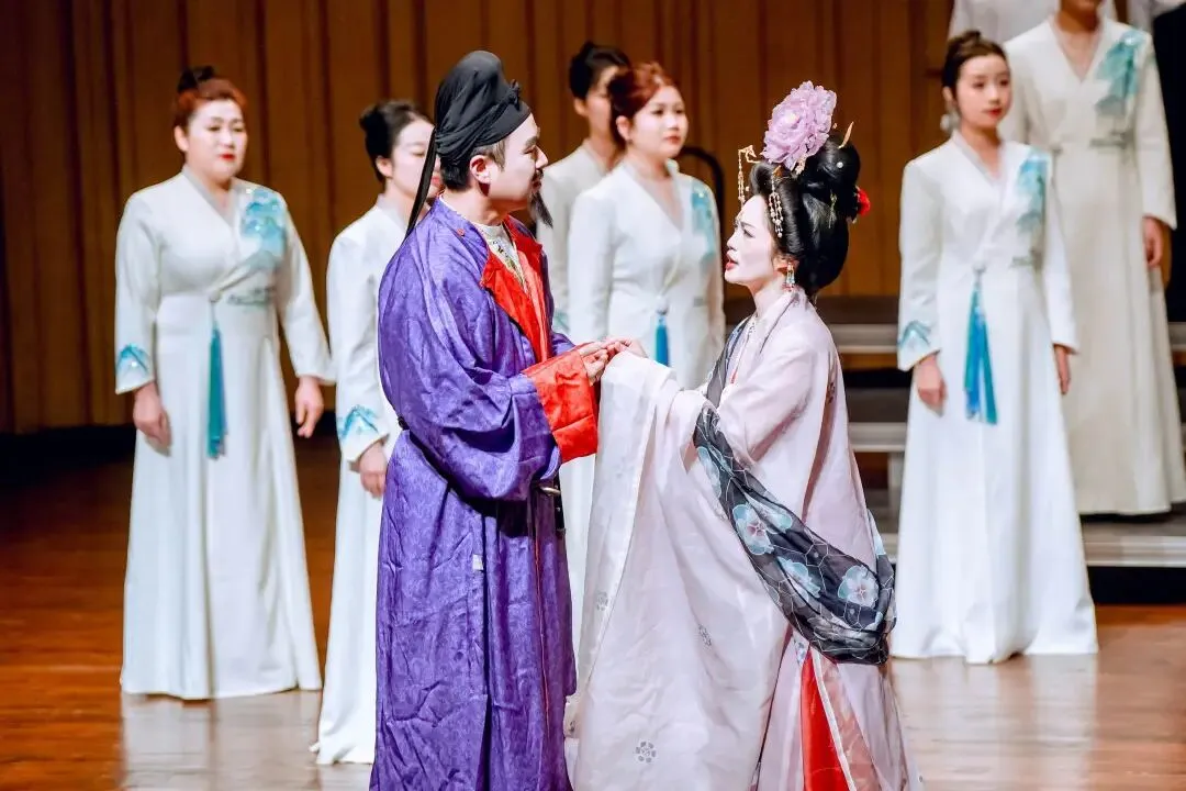 音乐会上半场演绎了经典清唱剧《长恨歌》选章。该剧由我国近现代作曲家黄自和词人韦瀚章于20世纪30年代创作,取材自白居易的同名长诗,是一部在战火岁月中诞生、融合西方作曲技法与东方古典诗韵的音乐史诗。音乐会下半场聚焦“湘土新声”,集中呈现《绿鸟崽》《妹在深山打呦吙》等植根本土、融合创新的原创合唱作品,生动诠释了长沙合唱团“湖湘为魂、时代为声”的创作理念。