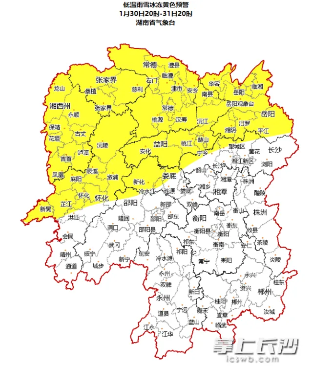 需特别注意的是,湖南省气象台预计,1月31日上午,受冷空气影响湘中以北将出现雪或雨夹雪天气,怀化北部、益阳西部局地中到大雪,1月31日下午过程结束。1月30日,省气象台已发布低温雨雪冰冻黄色预警,预计1月30日20时到31日20时,湘中以北部分地区将出现雨夹雪或雪,且最低气温低于2℃,其中黄色预警区域包括长沙西部、湘西州、张家界、常德、益阳、岳阳、怀化中北部、娄底西部。