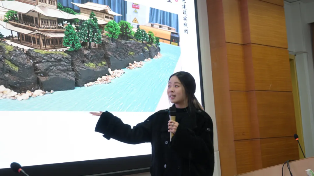 随后,2025级研究生王慈衣、黄晴分别围绕石鼓书院、恭城书院的实践过程,从红色历史背景、建筑空间布局、书院精神文脉等方面展开讲解,并现场展示了精心制作的建筑模型。