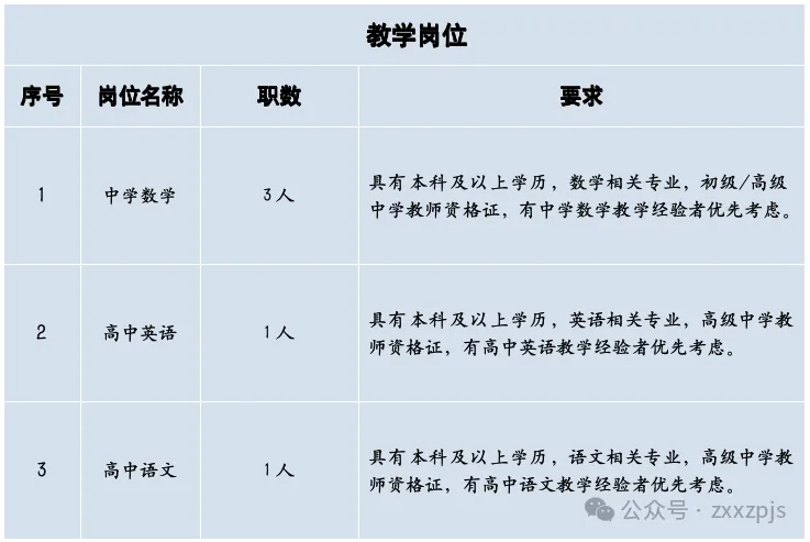 2、岗位要求:年龄35周岁以下,有良好的职业道德素质,热爱教育工作,遵纪守法,爱岗敬业,品行端正,无违法犯罪记录。本科及以上学历,专业对口,具有高中教师资格证,普通话二级乙等以上,有教学经验者优先。