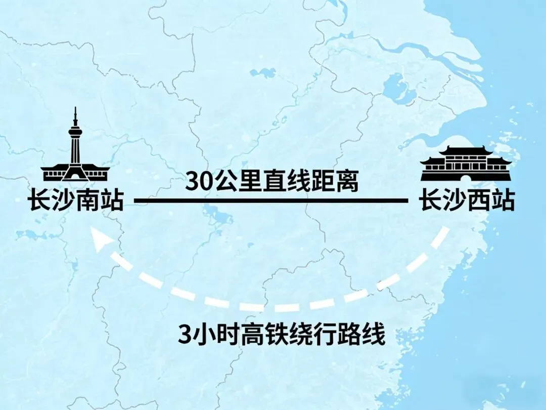 “从长沙南站到长沙西站,坐高铁居然要三个多小时?”前段时间与同事的闲聊,道出了不少长沙市民的出行困惑。作为这座城市两大核心高铁枢纽,长沙南站与在建的长沙西站直线距离不过30余公里,却因缺乏直达铁路联络线,让跨站出行沦为“长途跋涉”。这一现象的背后,既是长沙高铁枢纽从“单中心”向“双枢纽”转型的阶段性阵痛,也折射出中部交通重镇构建高效网络的迫切需求。