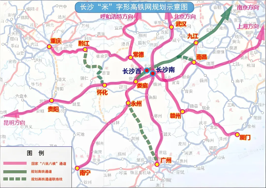 更值得期待的是,长沙正通过多维线路布局,构建“双枢纽联动+六网融合”的铁路网络。长沙西至沪昆高铁连接线(长韶娄高铁)已启动预可行性研究,这条设计时速350公里的线路,从长沙西站经宁乡、韶山至娄底,衔接沪昆高铁与呼南高铁,不仅填补了长沙枢纽西南向高铁空白,更能通过联络线实现两大站的高效互通。