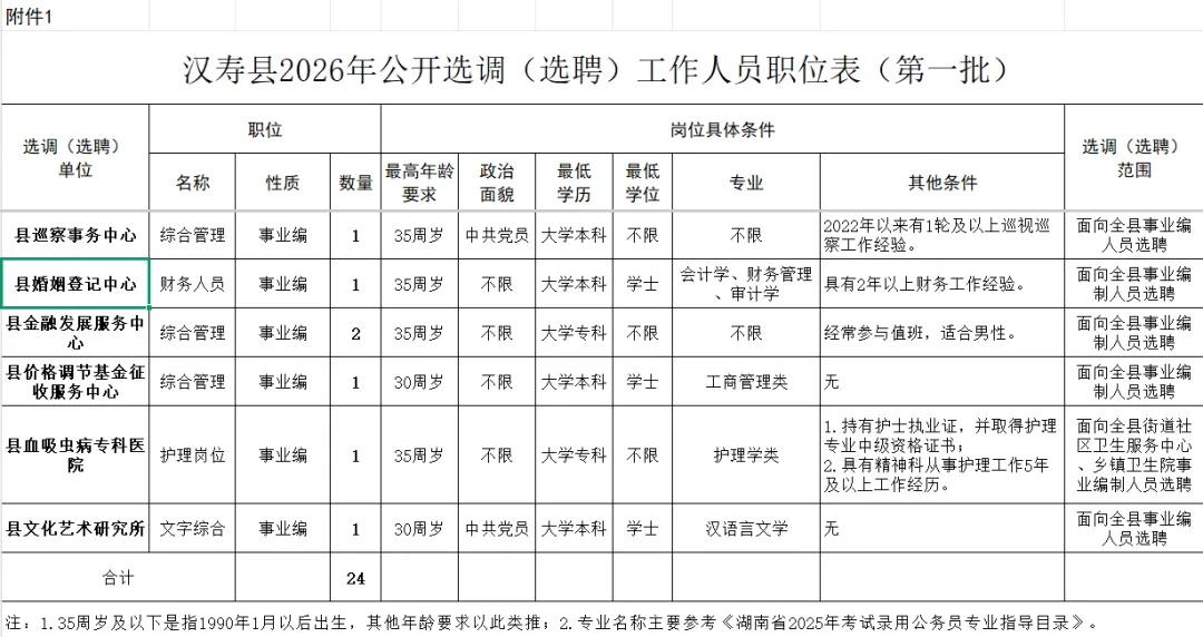面向全县机关或参照公务员法管理的单位中已进行公务员或参公登记且在编在岗人员公开选调17人。面向全县事业单位中在编在岗的管理岗位工作人员或专业技术人员公开选聘7人。具体职位和资格条件详见《汉寿县2026年公开选调(选聘)工作人员职位表》(附件1)。