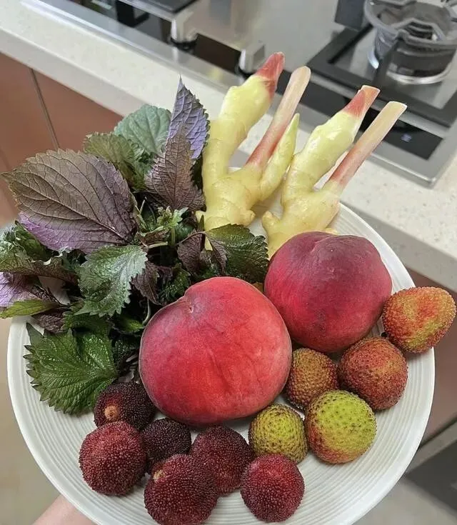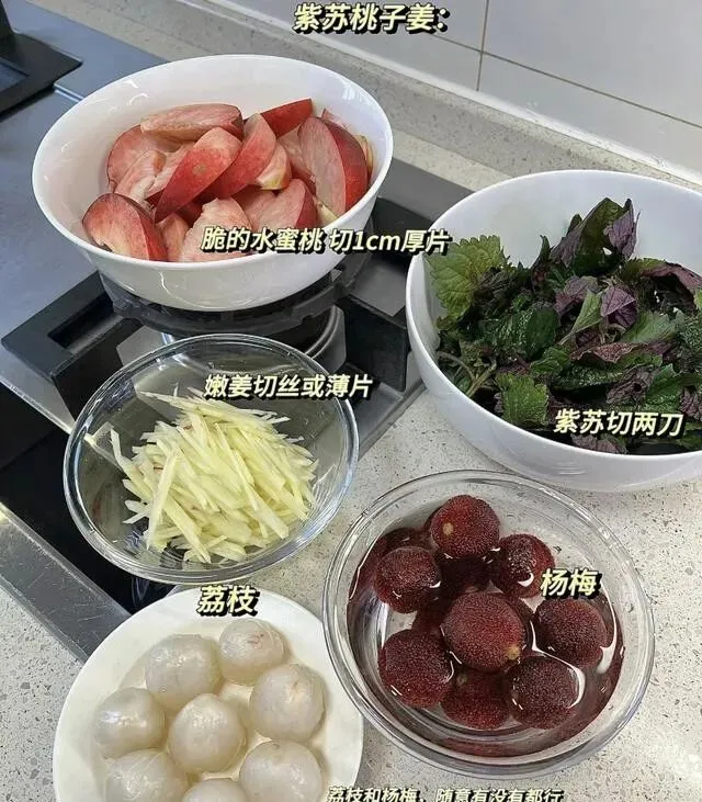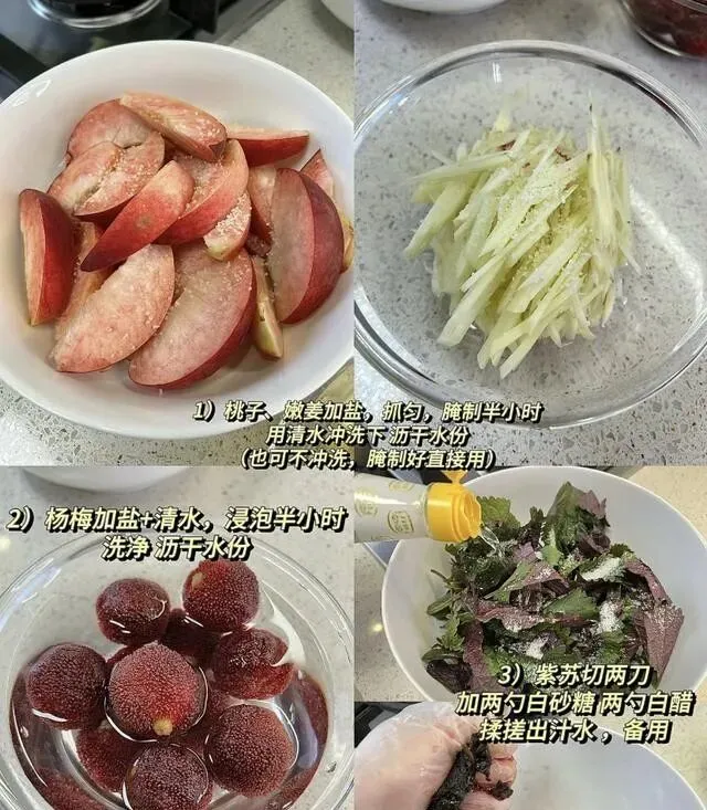 脆桃 , 紫苏叶 , 嫩姜 , 冰糖 , 白醋 , 盐。