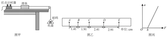 (4)若实验小组忘记平衡摩擦力,用F表示滑块所受绳子拉力,得到的滑块加速度a与F的图像如图丙所示,已知图线的斜率为k,横轴截距为b,则滑块的质量为,滑块与水平长木板间的动摩擦因数为。(用物理量字母k、b、g表示)