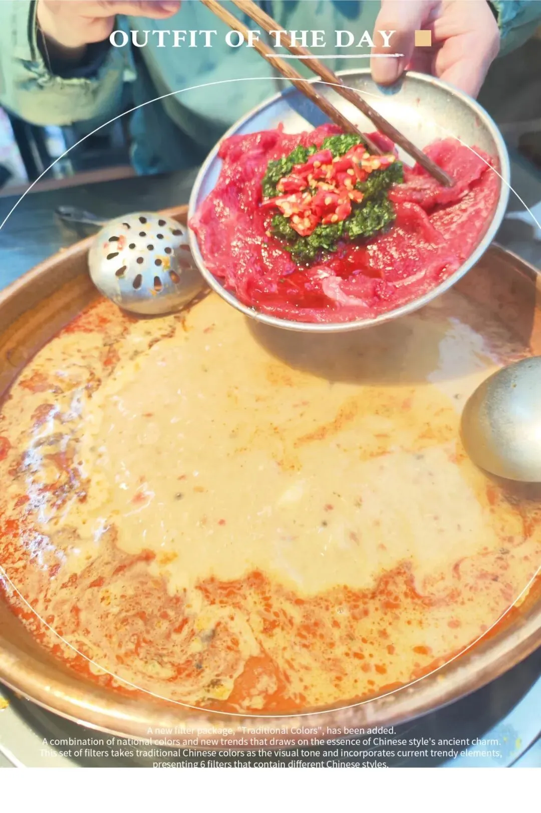 - 棒打薄荷鲜牛肉:大片薄切的牛肉裹着薄荷碎,在滚烫的汤底里涮8秒就熟,滑嫩的牛肉裹着鲜醇汤汁,薄荷的清香瞬间解了腻,一口下去层次感拉满。
