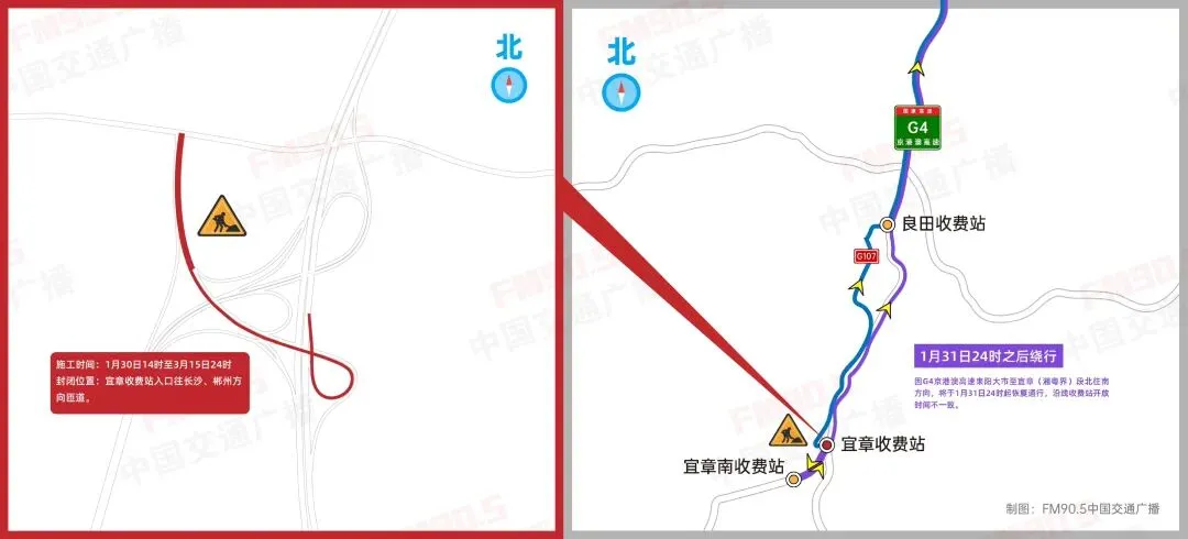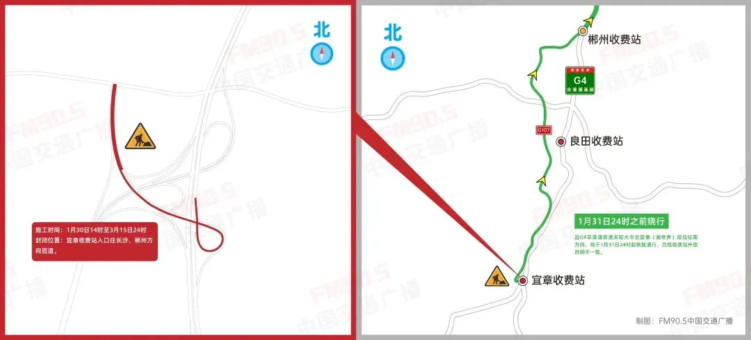 近日,从湖南省公安厅交通管理总队高速公路交通管理六支队、湖南省高速公路集团有限公司郴州分公司了解到,因应急施工需要,1月30日14时至3月15日24时,G4京港澳高速湖南郴州段宜章收费站入口往郴州、长沙方向匝道全封闭施工,期间所有车辆需绕行。