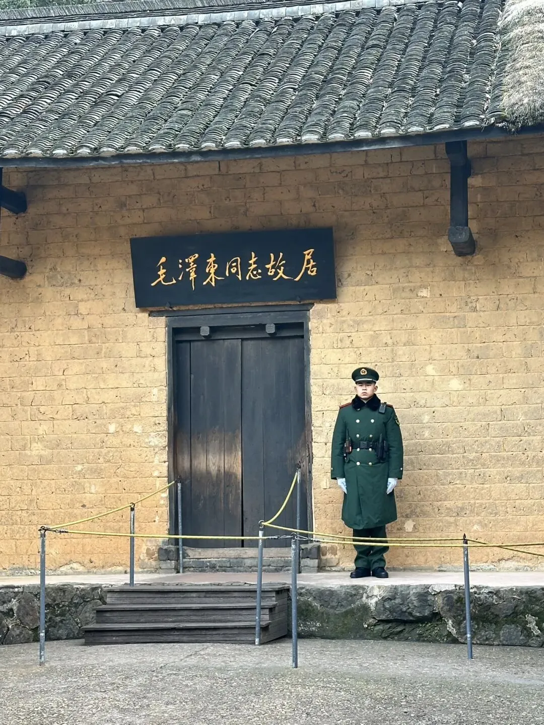 午后驱车前往韶山,这片孕育伟人的红色土地,自带一种庄重与温暖。走进毛泽东故居,黄墙青瓦的江南农舍依山傍水,土木结构的屋舍质朴又亲切,屋内的陈设简朴而真实,仿佛能看见伟人少年时在此生活、读书的身影。故居旁的铜像广场上,毛泽东铜像巍然伫立,来自五湖四海的游人满怀虔诚瞻仰、鞠躬,微风拂过松柏,满是对伟人的深切缅怀。